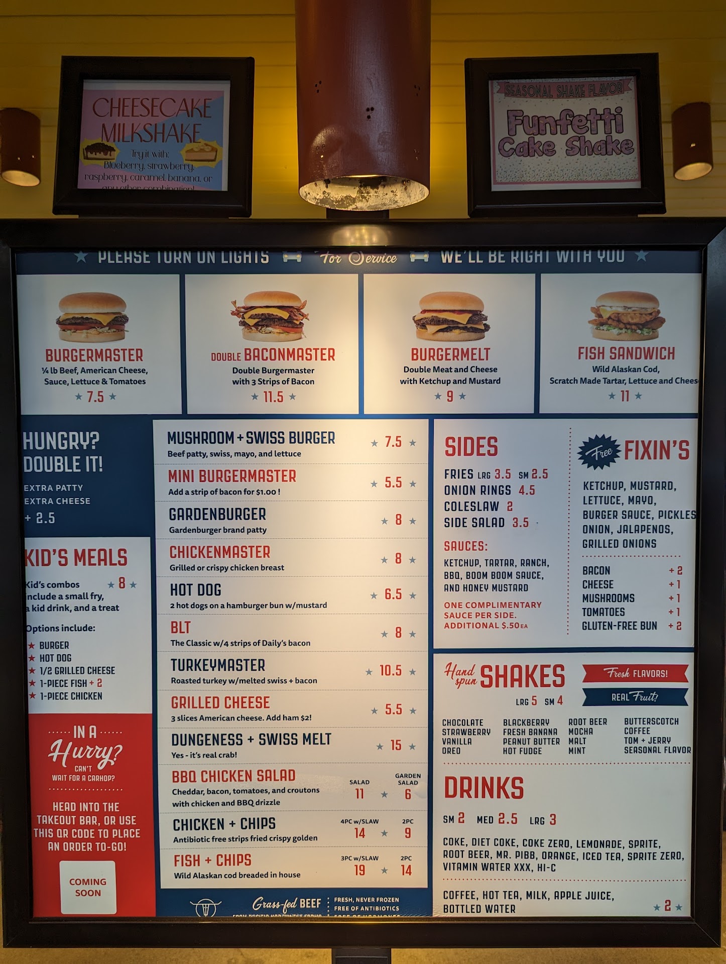 Read moreI ordered takeout before arriving but only the shake was ready. I waited with my 4yo son in the tiny checkout area for 20 minutes (15 minutes past online order estimate) with my son wanting to go to the restroom halfway but I told him our order should be done any minute. I couldn't believe how long it took so I asked the register again and apparently it had been ready for some time already!! They forgot about us while we were standing right in front of them for 20 minutes! The burgers and fries were very soggy (they're not supposed to be), probably as a result of the terrible service. The man at the register said "we don't take orders to the front" which I think means they don't bring them to the service area for wait staff, but hello? I was standing right in front of him, just tell me the order is ready?? I didn't want to be that guy constantly coming up and asking for our food but I guess that's what you...