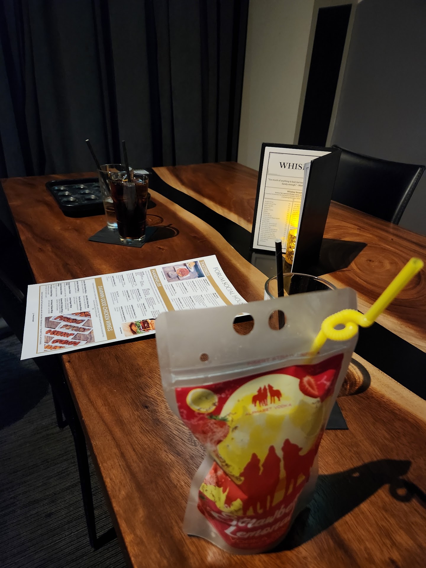 I had a great time at Forum. My servers were friendly and attentive. Everyone seemed to be having a great time. We had the sliders, and I got the Mackin cheese to go. I'm not sure if trying the mac there would be better, but it wasn't great as far as flavor went. The sliders were tasty! I got a side of the black garlic sauce for the fries... fantastic! We also got the "That's my Jam!" Crostini with the goat cheese, caramalized onions, and balsamic glaze over arugula. It was okay, but the goat cheese and caramalized onions were ice cold. It was also just lots of sweet, which didn't give much variation in the bite. We got the Forum Paloma and the Adult Capri Fun. I LOVED the Capri Fun. It was so good that I got another one later!