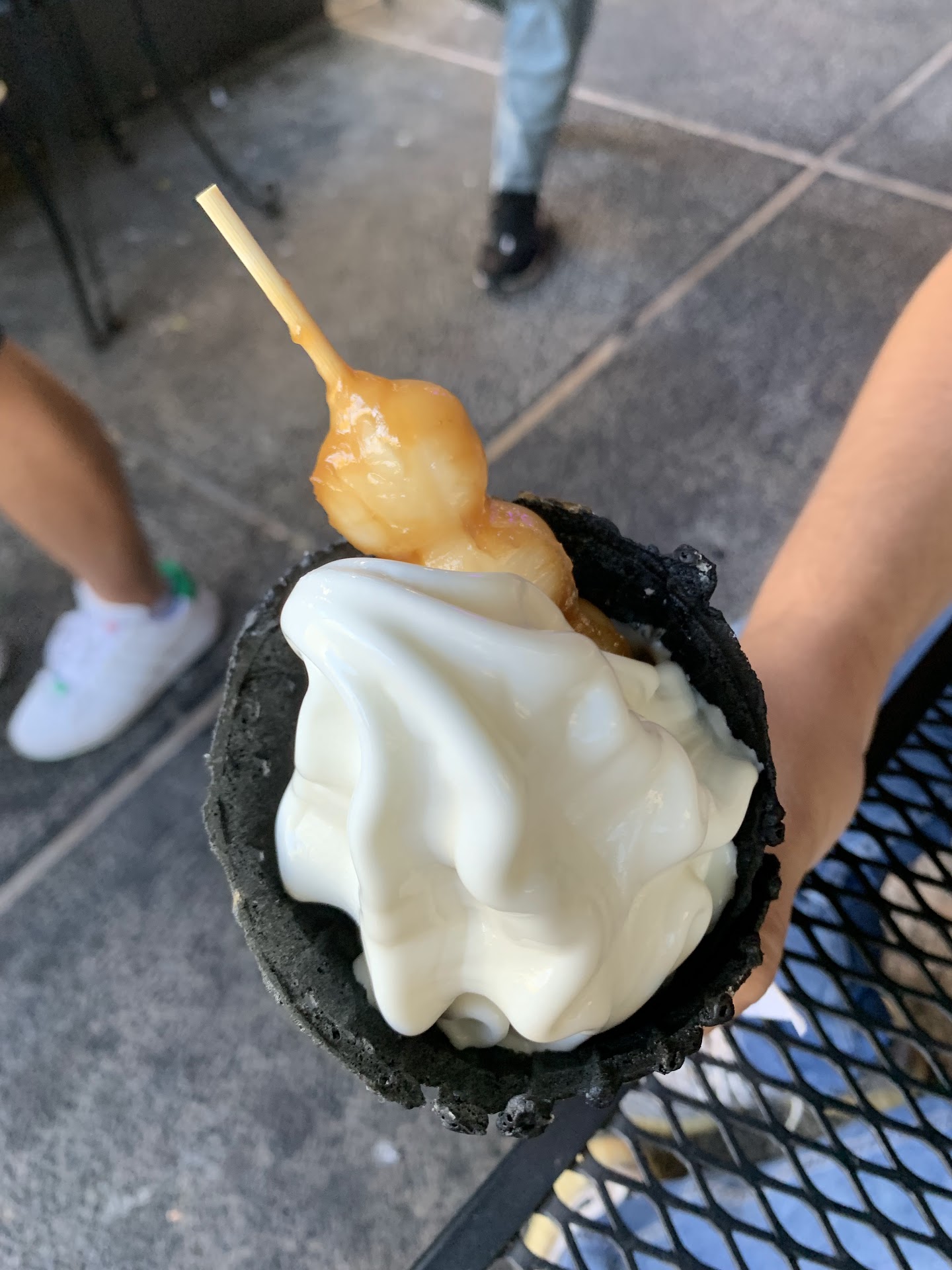 My bf got milk flavor in a cone with dango, I got swirl flavor in a cup with MBR and hojicha sauce. We just ordered whatever toppings bc not sure what was good. Wish there was a breakdown/description the toppings listed on the menu (yaki imo, warabimochi vs. regular mochi, hojicha, etc.) because there weren’t any employees near the kioski and there was only 1 functioning kioski to order the soft serve thru, so we couldn’t really ask anyone as the line was building. But can’t really go wrong with ice cream, so we just winged it.