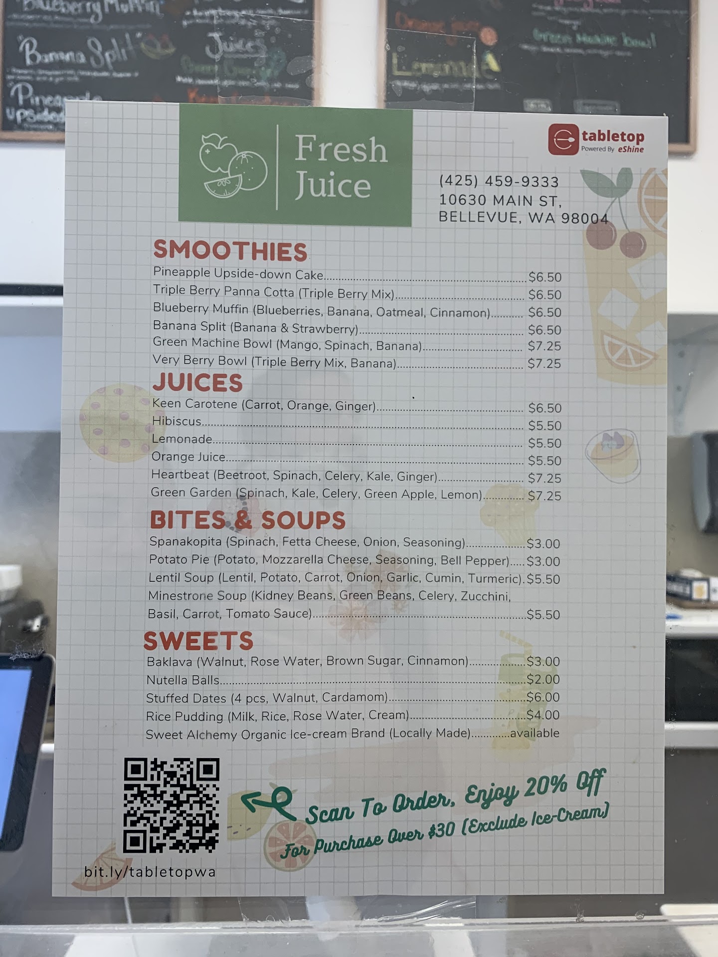 Read moreI stumbled upon this little gem and need to rave. I met the owner, Joe, who said they only opened 4 months ago and it’s been a struggle (mid-pandemic and hard to see shop). I went in for a fresh juice that he custom made to my request. Green juice that was so good! Then I bought his wife’s homemade savory pastries and he gave me a taste of the lentil soup which was amazing. She also makes a baklava in a roll shape that’s not as sweet as regular baklava, thus much better.