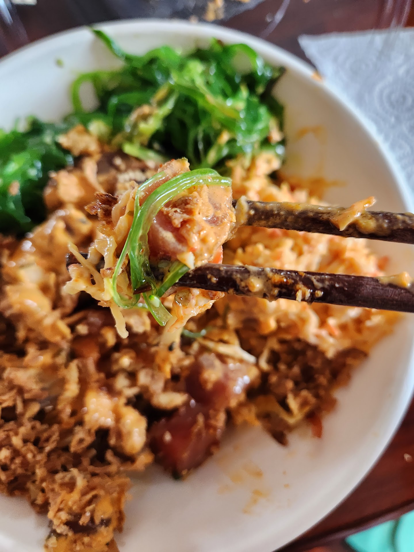 process: kind of like a subway/Chipotle, you build your own bowl. I personally like to buy poke by the lb. You choose a size then the base ( rice/ salad) and types of fish then sauce and topping. They also have a seasonal protein so it could be shrimp or scallop. Generally this place is pretty fast unless the person in front of you has a problem making deciding .