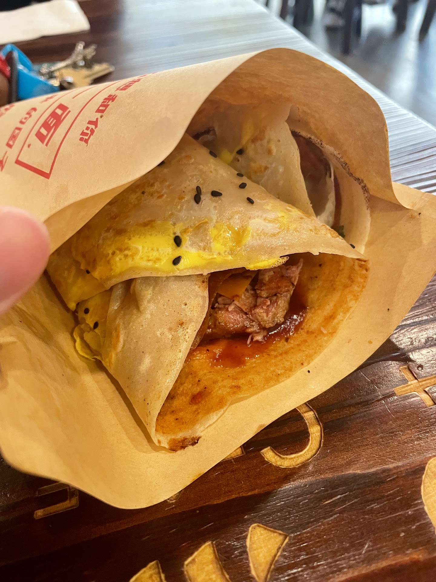 Ordering is easy with their self-service kiosks, and I’ve never had to wait in line. The menu features a wide range of crepes, from roast duck to squid and crawfish, with options to customize spice levels. My personal favorite is the Peking duck crepe, which is flavorful and satisfying. Pair it with their soybean milk and tea-infused egg for a complete meal—it’s a combination I highly recommend.
