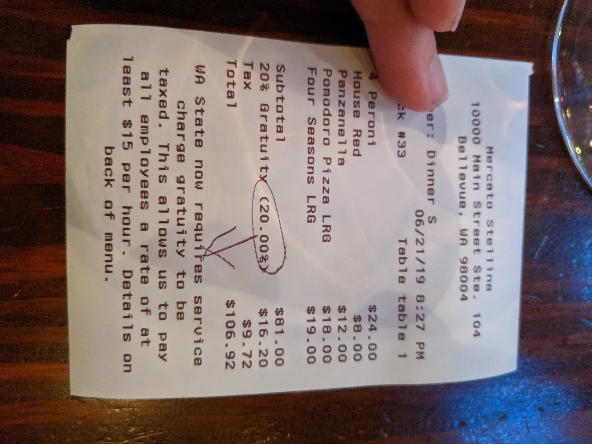 Read moreThis establishment charges YOU tax on top of their mandatory 20% gratuity that they claim is a Washington state requirement. This is a blatant lie. By taking away the patron's option to give whatever tip they feel is earned, and instead forcing the patron to pay 20% gratuity on top of the bill as a part of the bill, the establishment now owes the State tax because they have taken away the patron's voluntarily tip privilege. Washington state does not require a service charge gratuity to be taxed if it is a voluntary option - as is expected at most establishments (that blank tip line). This is a way for this establishment to take money from their patrons to pay THEIR taxes under the guise of "helping to pay their employees a minimum of $15/hr". I would never recommend going to an establishment where they put the burden of their tax responsibilities on their patrons.