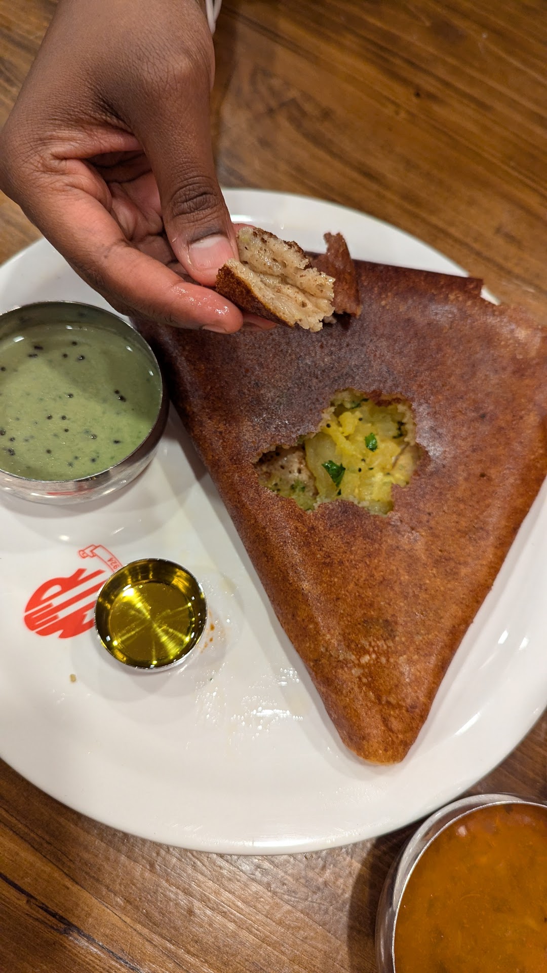 Masala Dosa In addition to the Benne Masala Dosa, we also tried the traditional Masala Dosa. The Masala Dosa at MTR was expertly crafted, with a perfectly crisp exterior and a flavorful potato filling that was both hearty and satisfying. The dosa was served with chutney , sambhar and ghee – each offering a unique flavor profile that complemented the dish wonderfully. The sambar, with its rich and tangy taste, was the perfect accompaniment.