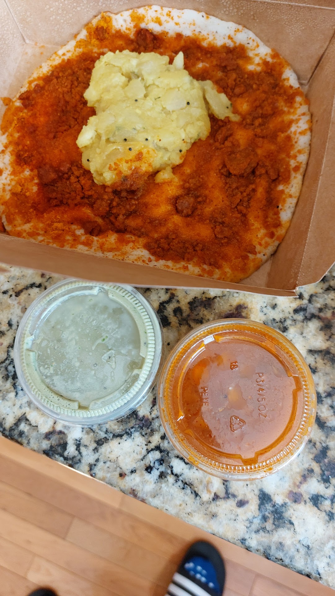 This is a second visit but this time I ordered takeout because my wife wanted to try something else just to see if we were perhaps mistaken earlier. I selected an order of Poori with the potato sago thing and a Pudi Dosa. The sides of sambar, chutney and potato accompaniment with the 25 cent piece is to show the quantity they provide for a meal. The lady assured me that the potato sago contained no nuts. I checked 3 times and also after paying because of allergy concerns. When I picked it up, the lady said the sago contained nuts but just as a garnish which means they have no ideal of what "nut allergy" means and substituted a vegetable curry instead. I mentioned that I wouldn't have ordered if they had properly checked and I got a dumbfounded stare in return. They gave me the potato anyway to compensate and you can see the quantity they serve. The little cups are what most restaurants give condiments like ketchup and salad dressing and MTR uses it as a "to go" container. That's how much food we're buying for $12.00. The dosa didn't look much better either and is also pictured with the dry unappealing filling and the chutney and sambar. The restaurant's response to my earlier review of the first visit was to suggest that I should adjust my errant expectations and to return so that they can school me in the ways of consuming South Indian food. I didn't think there was going to be a tutorial or a TED talk on "how to eat dosa" but apparently there is. I can't wait for tickets to go on sale because I've only been South Indian since I was born. I got a backup meal at...