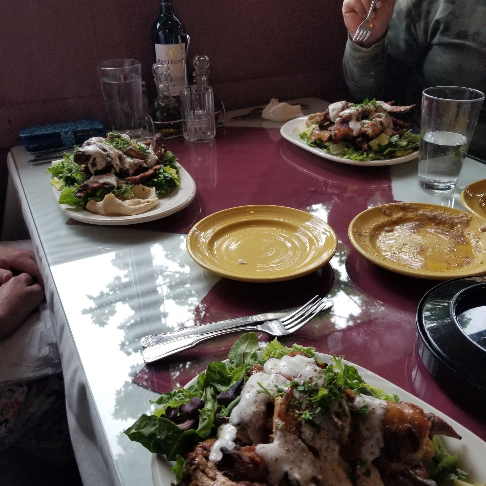 The ground lamb and the chicken skewers were both concerningly pink and ultimately led us to discard the meal.