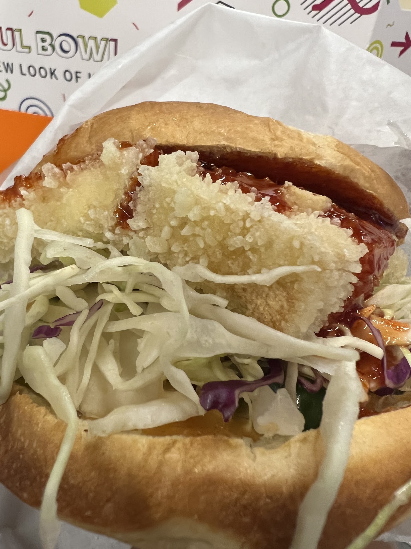 After all these years, there still isn't a decent food court in the shopping complex. The little food court at the Lincoln Square section of the shopping complex was the only food court we could find on the legend and we were not expecting much. After a very quick walk around of the vendors (there were less than a handful), we decided on Seoul Bowl. They did not have fried chicken so I ordered the fried tofu sandwich.