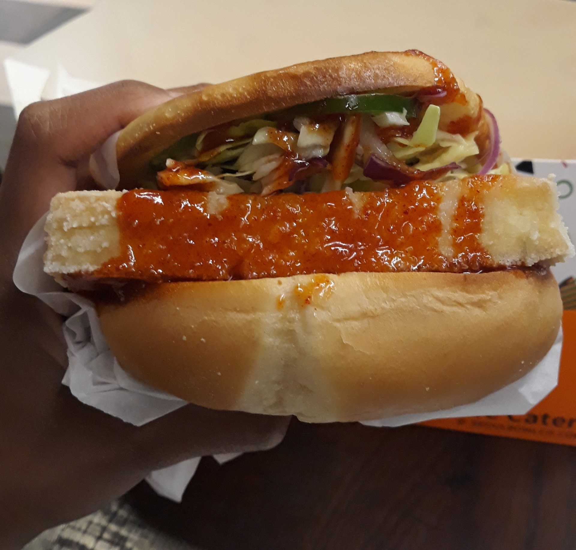 I'm glad they did not have fried chicken. I could have fried chicken anywhere. The fried tofu sandwich was amazing. The crust was light and crunchy and the tofu itself was dense. The sauce was rich and tasty and the bun was soft. Every single bite...
