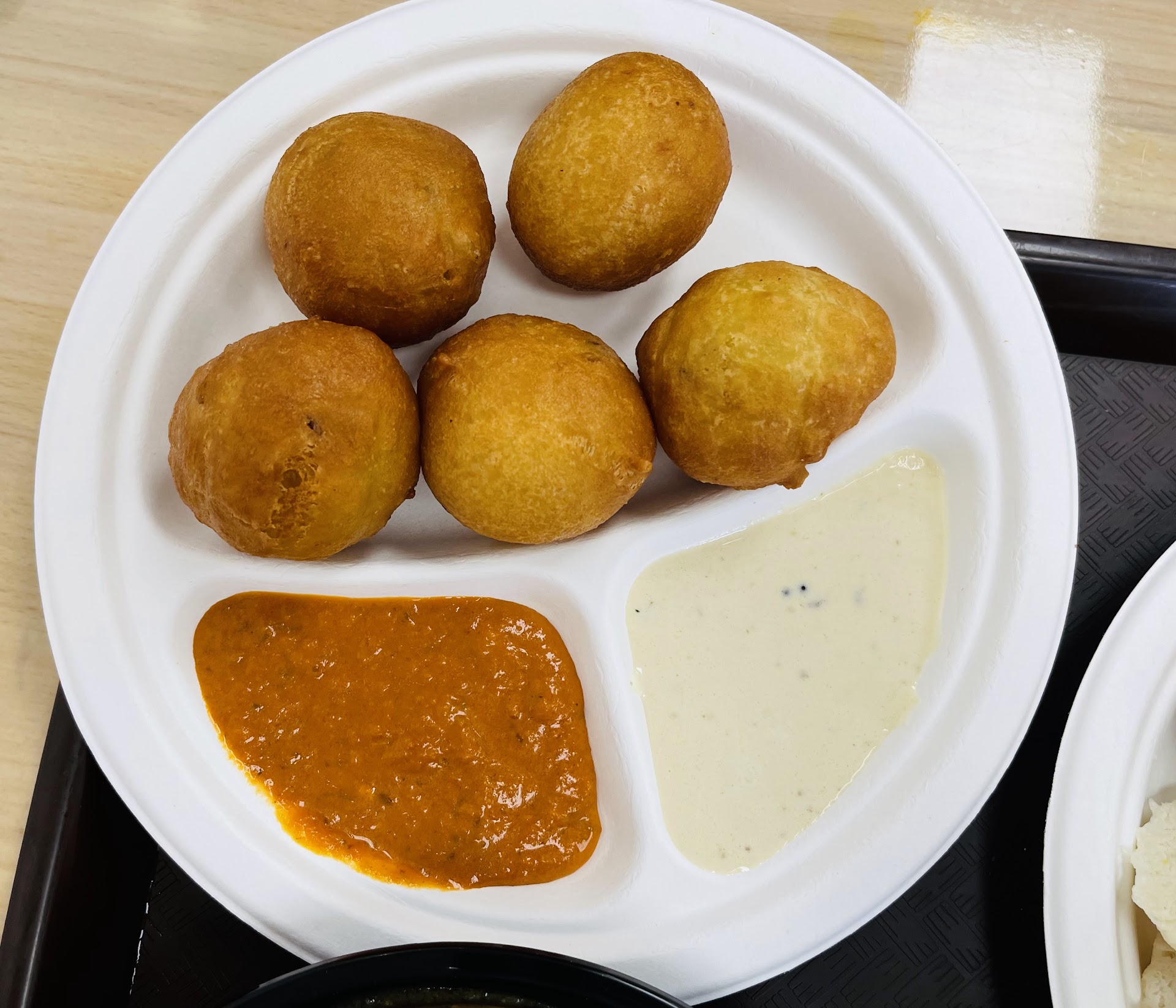 There are four curries available: two meat, and two veg. I ordered a Thali plate with curry, and my husband ordered the chicken curry with rice, plus a few Samosas on the side. I wanted a mix of meat and veg curries, and was fine with paying the meat-curry price since it was just $1 more.