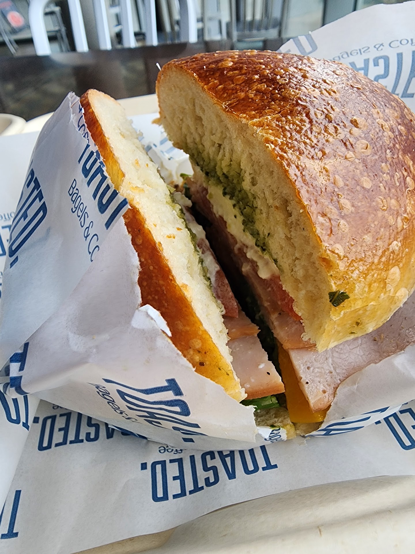 Read moreThe food was DELICIOUS. I got the chai rose latte, which I will absolutely be back for! I also got the Turkey pesto peach bagel which was super yum! I love the addition of the (canned)peach for sweetness. My husband got turkey bec which he said hit the spot and he loved the flavor of the Turkish coffee served in a cute cup and saucer. I hate to say anything negative about the atmosphere because the actual restaurant area was very cute with plants and brass decor. The sitting area which is a shared space with other restaurants was very clean but had a basic, modern, cold, food court vibe with metal chairs. There are nice big windows though. Maybe when it gets busy it feels more cozy. We came early in the morning on a mid week day and it wasn't very busy. I wished they had some flowers in the window sill or something. The main important thing is the food, location and...