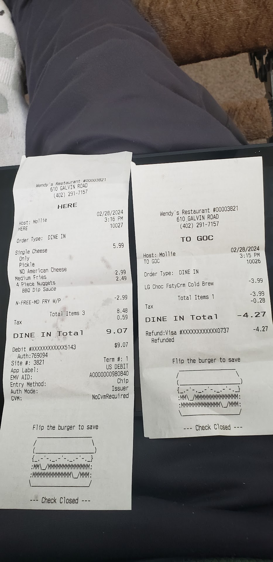 Read more10/10/24 I visited Wendy’s at Galvin Road in Bellevue, NE. I reside in Bellevue and have hit or miss experiences at this location. Yesterday’s experience confirmed that I will not return.