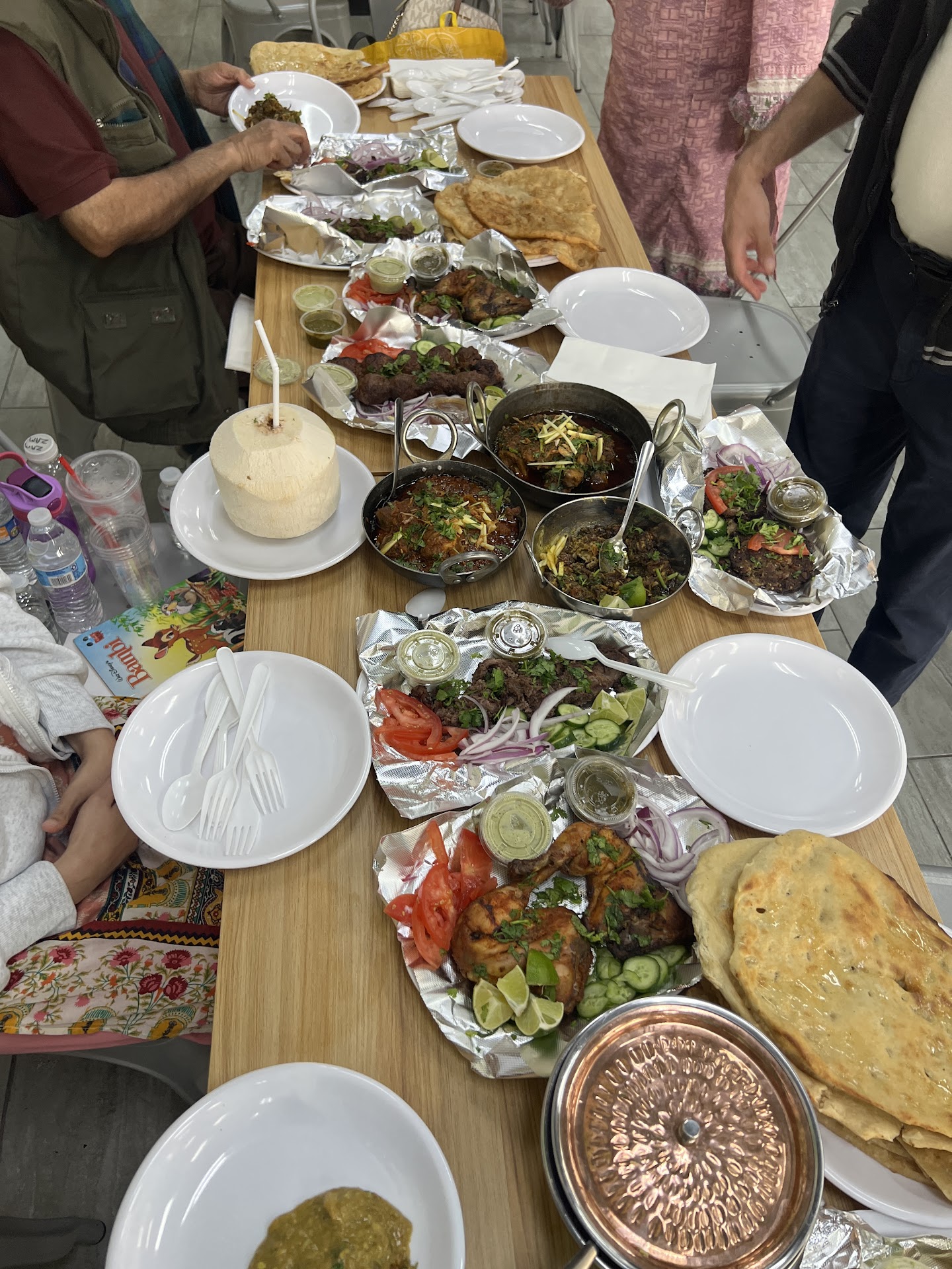 Great spot to bring the family! Lots of parking and long tables to accommodate large families. Clean space with plates, napkins and settings/utensils available easily as well as to go boxes. This is a big convenience. Decor - Awesome mural of Karachi on the wall evokes memories of childhood. Other side has framed photos of various sites. Across from the main wall is the cooking area where you can see the culinary artists at work.