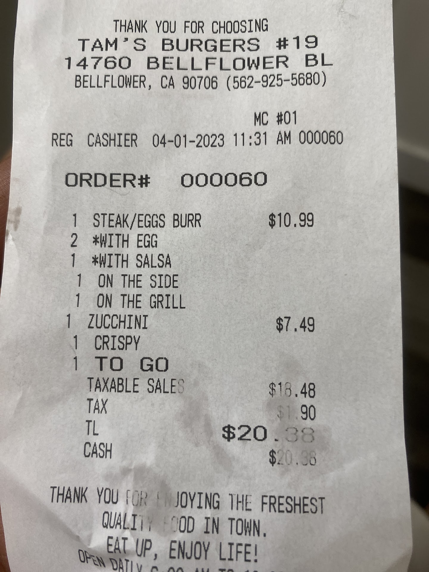Read moreTried this place again, the bacon breakfast burrito was dry, they offered salsa inside, but didn't put any. I got a side but still didn't help. Too bland and dry. The Tams on Alondra is 100 times better. This was it, I will drive further and will not be dinning here for as long as I can help it. 6/2021 Over a year ago was the last time I was here. Usually I drive a little further down Somerset in Paramount and I was reminded why. So a double Cheeseburger and fries are more than if I got it in a combo. Most places they're friendly and will advise you it's cheaper and you get a drink. Very inconsiderate if you think about it. Not thinking of the customers and probably will drive further to a joint that appreciates it's customers. But the worse part was that I ordered buffalo wings, what I got were BBQ wings. Sweet, not hot. I called them and the girl says well you didn't ask they're just little spicy, a 1 year old child could eat these and think they're candy. So I thought they didn't even have the drummets , but upon further examination, those bones at the top are it, no meat just bones. NEVER ORDER...