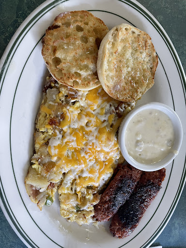 Read moreI ordered a steak and eggs, steak rare, eggs over medium, with cottage fries, biscuits and gravy. And coffee. What came to me was Christ's own sandal, stapled to a slab of oak bark. Or maybe it was a roofing tile. Or they served me King Tut's mummified hand. Whatever it was, it for sure was not a rare steak.
