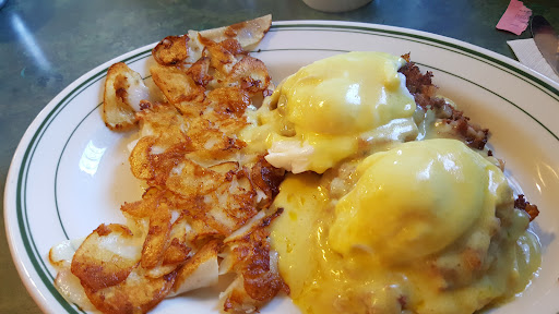 The locals flock come here so they say. And it is busy. It is very small and mostly counter seating only, with two tables that are available for seating two or more guests. Count on waiting if you come late, they open early at 5 am. Monday is farmer's market day at the park a few yards away, an excellent way to eat organic fruits and veggies in season, with free samples. You can park in the park if street parking is full, or in the Doctor's office next door, behind their building on the weekends they are not open. The decor in this place is old and has probably been unchanged since it opened pictures of vintage cars, muscle cars, and semi truck cab. Pretty country curtains and a there is a quaint antique red cash register at the till, my wife pointed out the details.