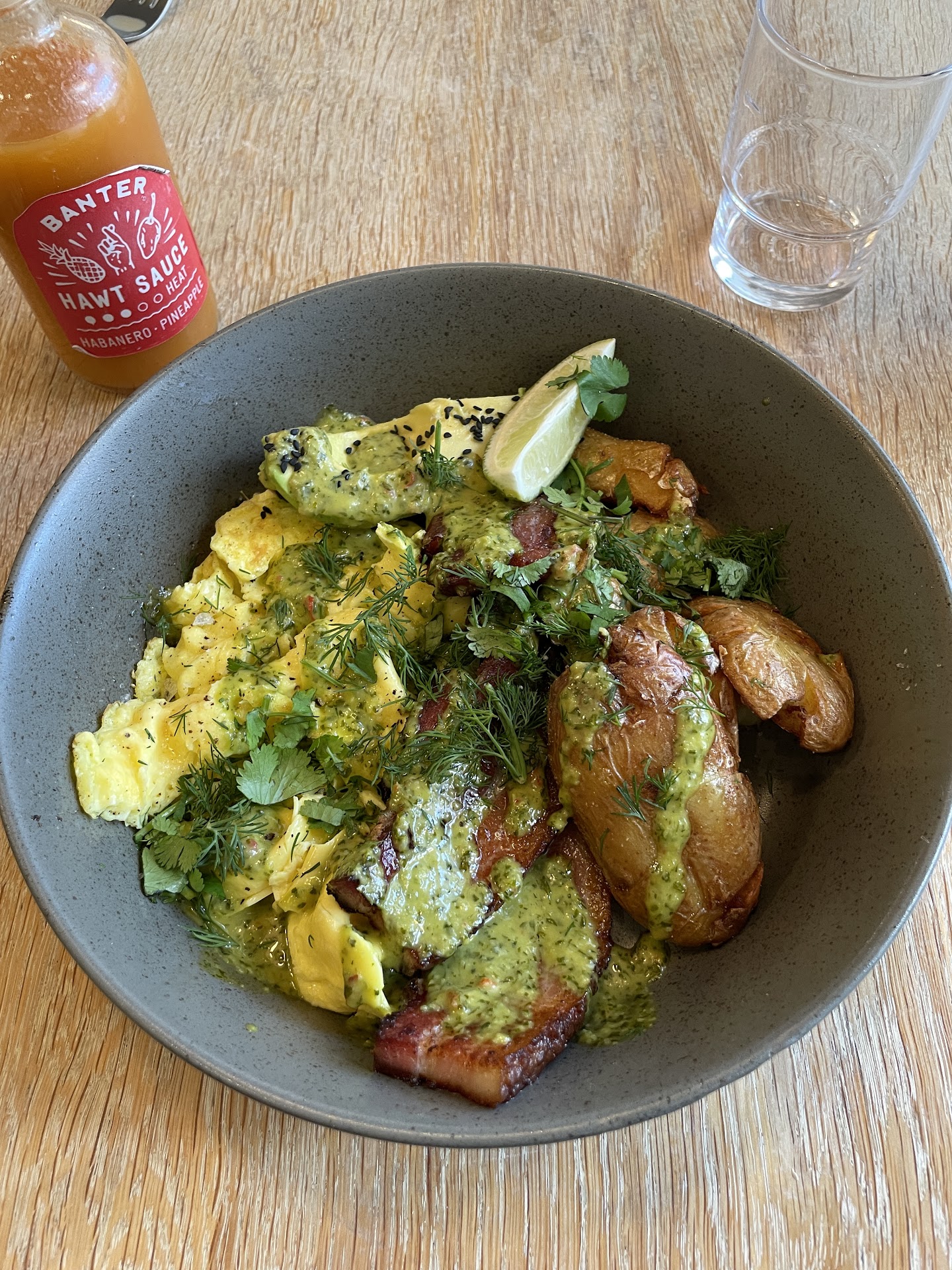 Point 1: The food was freaking amazing. I got what I think is the only gluten free option in the menu, an eggs and bacon and potato entree. It had a glorious, herby sauce that had cilantro and dill, and probably something else. There was a nicely ripe avocado with black sesame seeds. The bacon was nothing like what Iāve had before at a breakfast place; it was very thick (1/4ā at least) and cooked well (as in good, not overdone). The potatoes were creamy smashed fingerlings. I opted for no tomato but Iām sure it would have been great if I liked them. The eggs were cooked well and probably had some cream or something because they were a little brown on bottom but didnāt taste dried out. The hot sauce was great, not hot really (not sure about the reviews that said it was really hotā¦), but very good flavor. My meal was phenomenal in that regard.