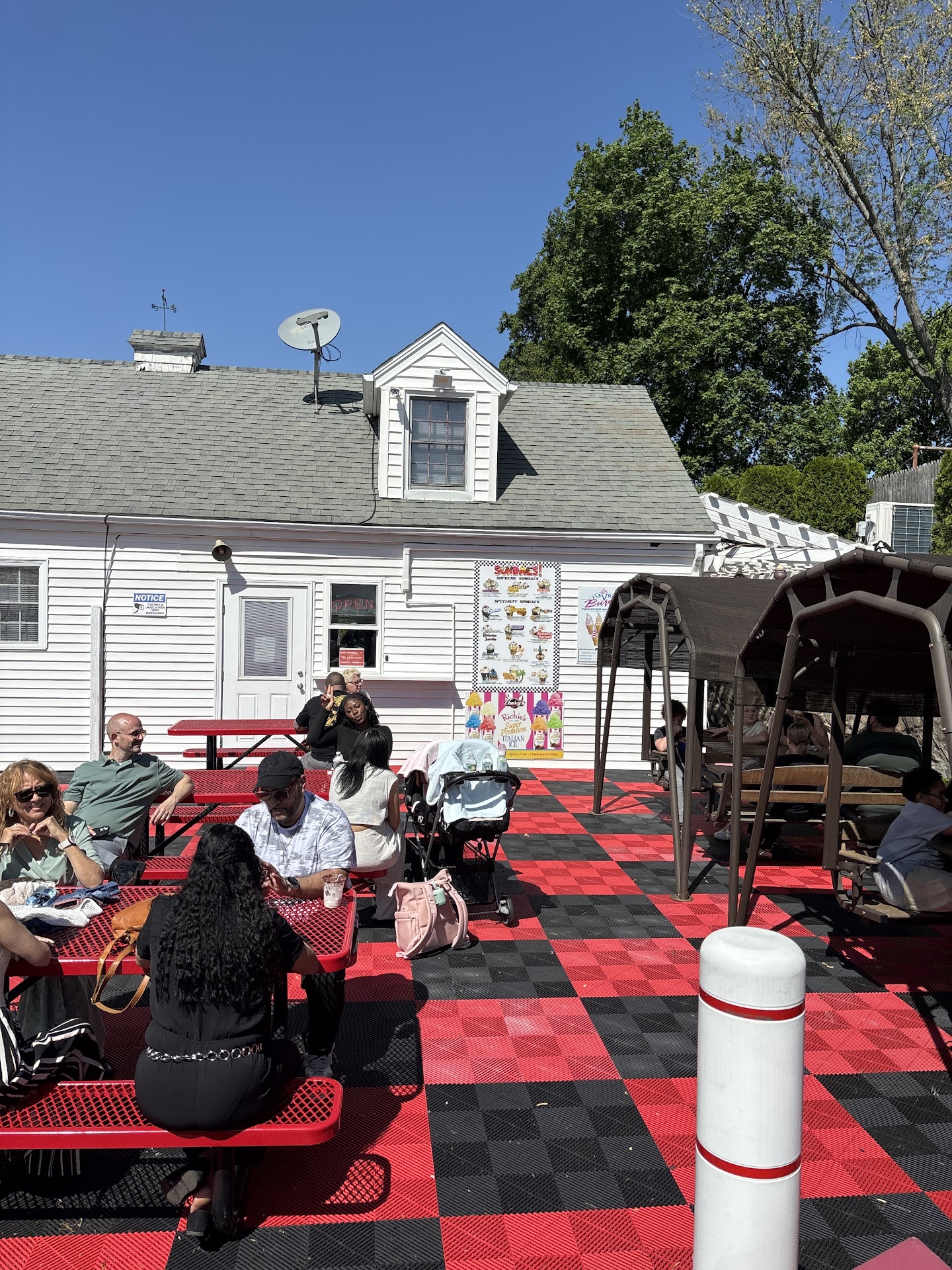 The service was quick and friendly even though they were very busy. You can sit on a bench, at a picnic table or lovely chair swings outside. There is no indoors to eat. My one problem is the prices are a little steep. Yes, ice cream is a treat and not mandatory- but it was $20 for 3 small soft serve flavor bursts with 1 topping. Still a great place to go, but only as an occasional treat for...
