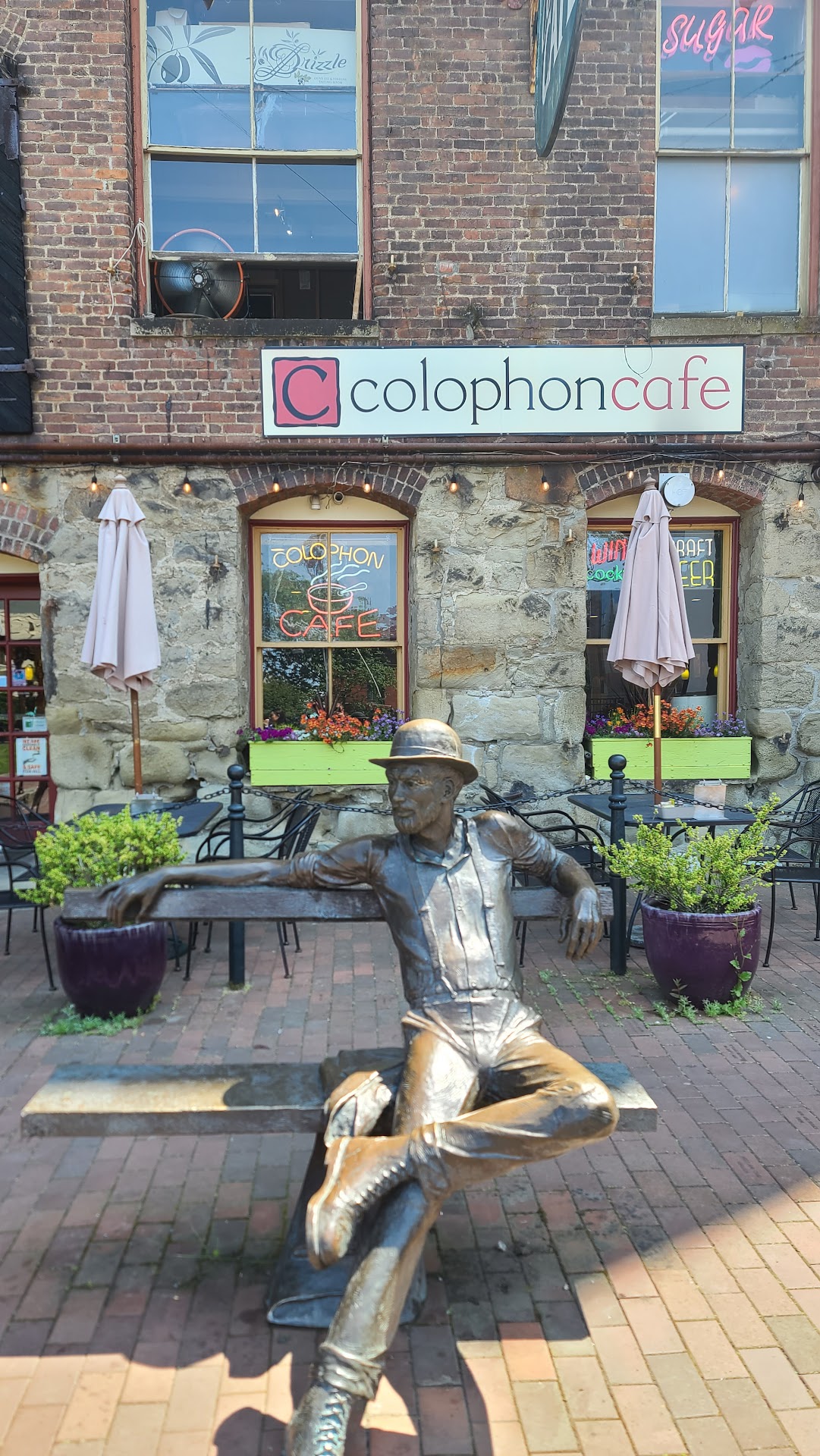 Read moreSome months ago I had extensive dental work done, before and after which I was unable to eat out (for about 8 months). When I finally did venture out (at the beginning of June), with my nephew for a late lunch, we landed on the Colophon Cafe and I ordered a burger (I was so excited to have a burger after such a long time of not being able to eat one). They don't serve mineral water (?), so I ordered a beer. When the server brought it, as she left, I realized she hadn't asked me how I wanted my burger so I called her back over and politely said "You didn't ask me how I want my burger." She said; "We serve them medium-well." like that was the end of the conversation. She had NOT informed me WHEN I ORDERED THE BURGER, nor was it posted on the menu. I was really embarrassed to have to explain to her that I COULD NOT EAT WELL DONE MEAT. She stared at me as if I were really inconveniencing her and said NOTHING (She was rather strange with me even before I ordered anything. I thought perhaps I was imagining it 'til my nephew mentioned it himself). I looked at their menu and couln't find anything on it that I could eat. So we decided to leave. I clearly hadn't touched the beer; hadn't even picked it up. Our waitress said; "I can't comp you the beer". I thought 'Fine. I am NEVER coming back here. The entire experience was simply unfeeling and unprofessional. Instead, we went up the street to 'Le Chat Noir' and there, I had THE MOST AMAZING and SUCCULENT BURGER! Best of all, we had a lovely, friendly and funny waitress. Because of the traumatic and painful dental situation lasting well over a year, I was really nervous about eating out. Thankfully, Le Chat Noir made me feel welcome and at ease, and the food and service...