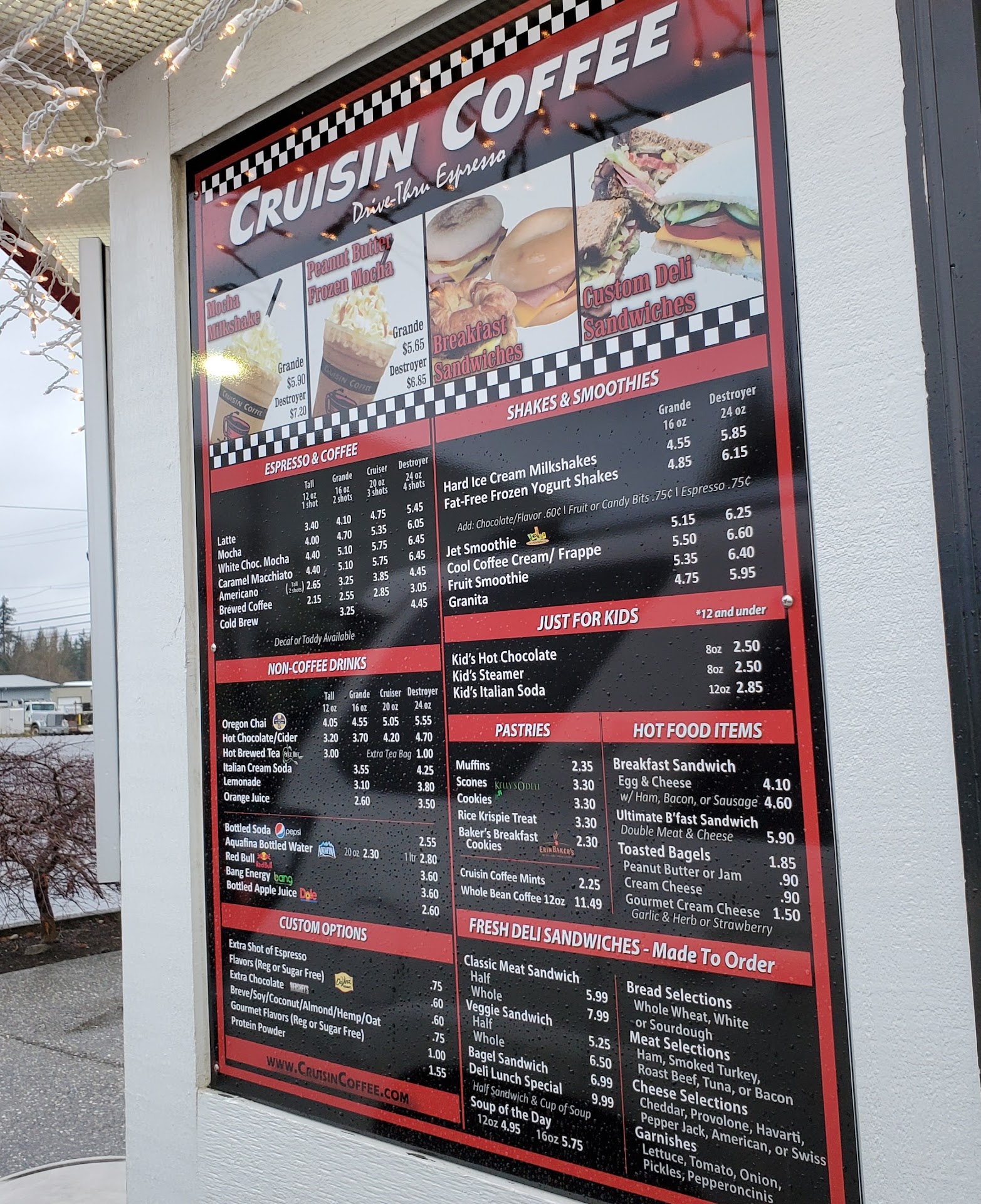 Cruisin Coffee is my place. I go there just about everyday and all of them are fine except this one... I just happened to be in the area last night and today. Last night the lady forgot my white chocolate which was whatever, not going to leave a bad review because of that, but then right now I just went there on my way to a funeral. For one they took forever in general, then they rang it in wrong, asked them to fix it, then I get my drink wrong, ask them to fix it, just to get handed a cup of milk.... My triple shot 16oz was WHITE and I couldn't taste any coffee. But don't have time to go back. SO...
