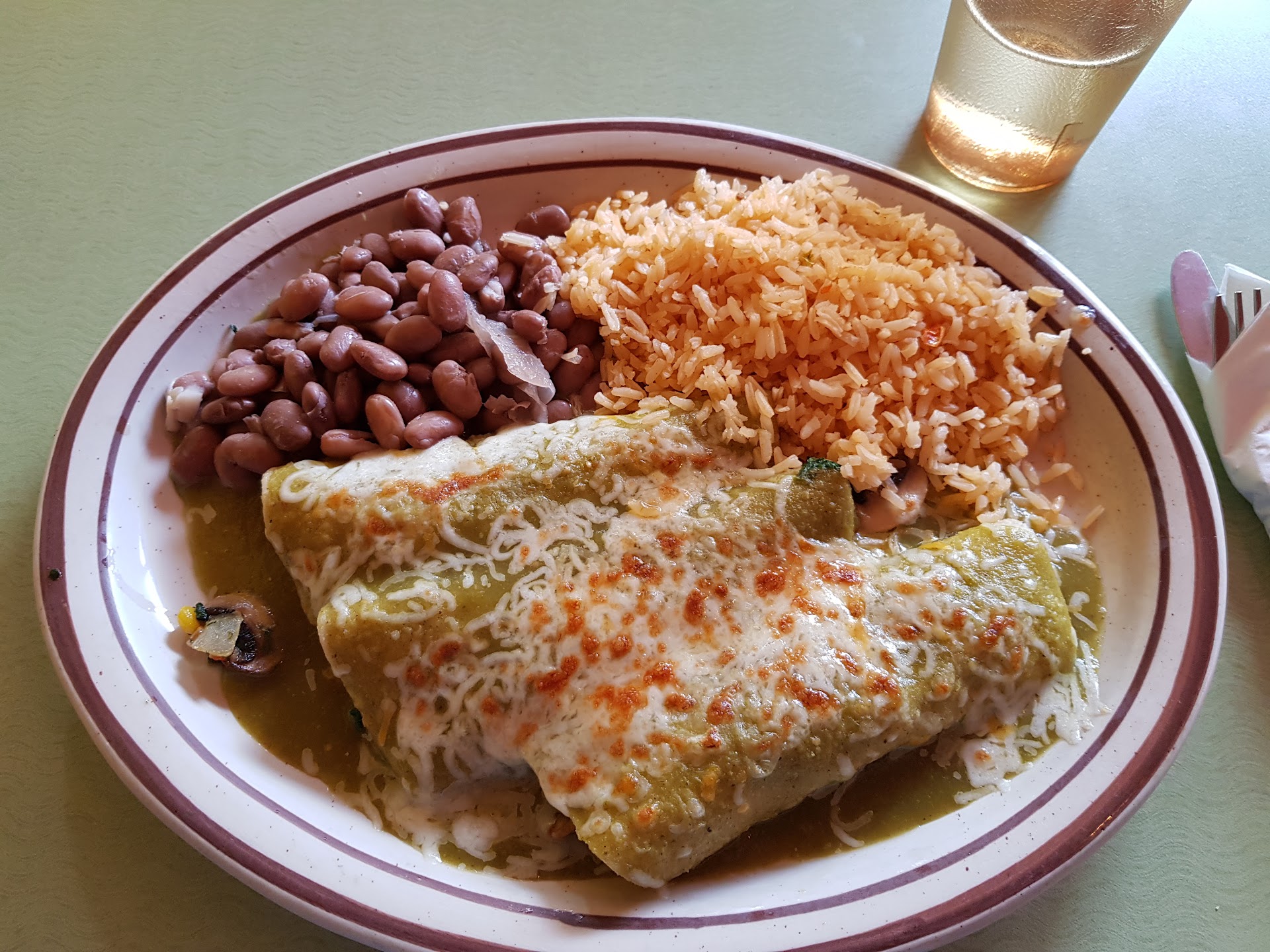 My order was togo (eaten while sitting on the bench right outside because I rode my bike there), and I try to be less picky in that situation because I don't think foods taste their best when not eaten hot, but I'll still note a few observations here for now. The chips seem to be home made but weren't warm. The guacamole had good flavor but it contained tomatoes, which wouldn't be in a classic guacamole. The salsa was very good. I had the two (cheese) enchilada lunch special and the serving size was generous. I'm vegetarian and got the black beans. The refried beans have lard but the whole beans don't. Overall I was satisfied with my meal but as a vegetarian it would be nice to have another protein option besides beans. (El Gitano has tofu on their menu, for example.)...