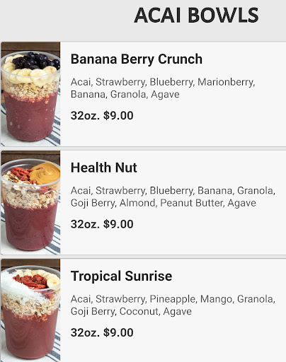 Read moreAcai bowls are incredibly weak, warm, sloshy, mealy and not fresh tasting. The fruit on top was also not very fresh or good. The granola was not very good and the staff could not confirm whether or not it was gluten-free, which is something you'd think a health-conscious place would pay attention to. They also are listed with photos of 32 oz large bowls online and are smaller and not worth the money in real life. I included a photo from their website of what the acai bowls are supposed to be like since the owner thinks I made...