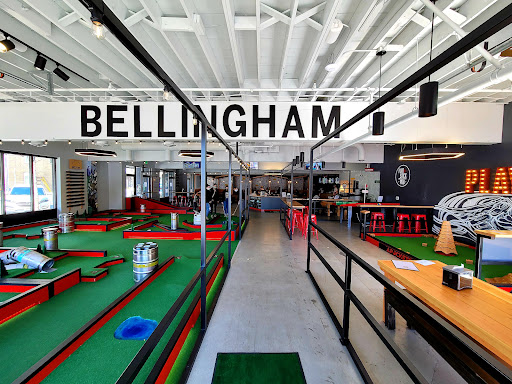 This was my first experience at Flatstick Pub. I've driven past the Seattle location many times and been intrigued by the concept. I was excited to find a location closer to home. Flatstick Pub has 2 rules: Drink Local and Have Fun. They source their adult beverage selection from local breweries - maintaining community as a pillar of their business model. There is a condensed 18 hole course that can be played an unlimited number of times for $10 per person. There are also other games set up as well. One is similar to beer pong, and another is called Duffleboard, a game proprietary to Flatstick that crosses shuffleboard and golf. There were also board games available to play. There is a bar, restaurant, and plenty of swag for purchase. My husband and I brought home a T-shirt in a pint glass for $15. This is a family friendly, noisy, environment - I personally would say for ages 8 and up, but all ages are welcome. There are golf putters for kids and adults alike. We ordered a Bogey Pizza $19 - sausage, pepperoni, olives, cheese, red sauce. It is SUPER thin and tasted good. It fed 2 adults. The mini-golf portion of the building is also pint- sized. There was a bachellorette party, a family of 4 adults, a party of 2 friends, a dad and tween daughter, my husband and I on the course at once. It was manageable. There is free, onsite parking. The two West windows are roll up doors, giving the space plenty of ventilation. There's a nice outdoor Patio space as well for those beautiful summer days and nights.