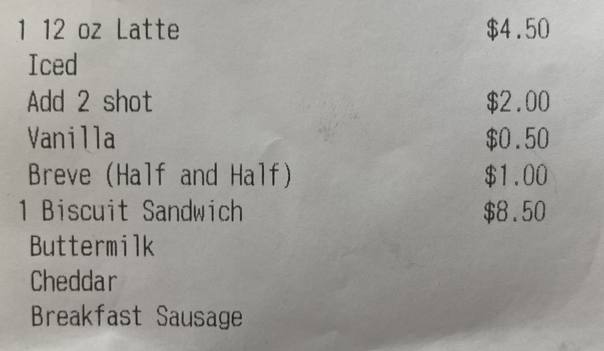 Read moreBought a coffee and a biscuit sandwich, came out to 16.50 before tax and tip. 20.43 after tax and tip. Espresso with half and half + vanilla, 4 shots, came out to 8 bucks. 8.50 for the sandwich. I was a little confused about how high the total was, not realizing the drink cost. Because she didn’t tell me the final cost before taking my card. The cashier got grumpy when I started questioning the price, which she wouldn’t tell me, then offered to print out the receipt. Ridiculous for a quad shot espresso. Will not be going again. Biscuit sandwich was super bland, subpar biscuits. Espresso shots were okay. Avellino or the Firehouse are better options. Feels like just another bland mediocre Bellingham...