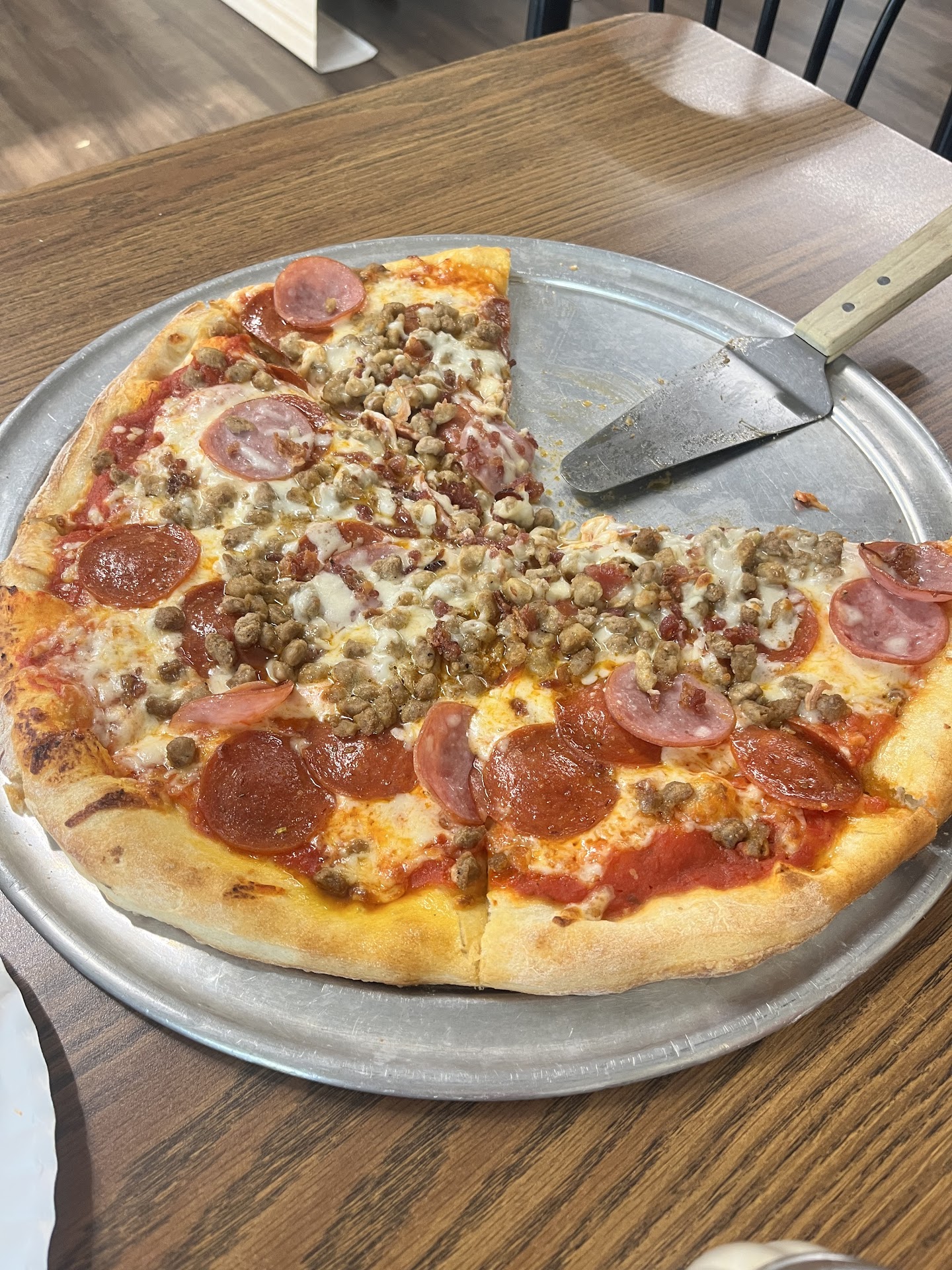 Read moreHave to say this was a confusing visit. The atmosphere was awesome, super clean, with space to offer. The menu was very easy to read. So here's what happened, so when we started to our we were told it would be about an hour for a pizzas, due to a large order they had. After a brief discussion, we placed an order for 1. 14" Meat Market Pizza, but got & paid for a 20" and 1 TX Philly Cheesesteak and 2 teas for $42. Since we were told it would take an hour, we left Bellmead to go to Central Texas Market Place as we got there. The Chep's called us and told us the order was ready. We told them it's would be 20 minutes and was told that was fine, it would be going out of the oven then. Well, the pizza wasn't "fresh" it had been waiting for several minutes, see the photo. However, the TX Philly was very hot. The inside was like new , so that an automatic 5 star. I'm going to give the service a 5 stars. They were friendly and attentive, but a bit hyper, and I bit hard to understand at times. I'm giving the food 4 stars because all of it wasn't present when it was made...