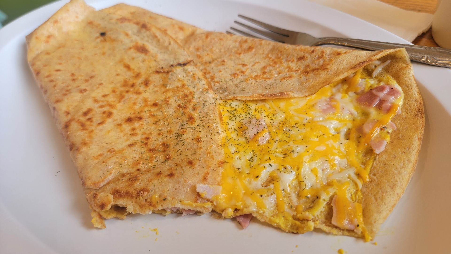 On that prior note, the food. I ordered a coffee with cream and sugar, with a ham, cheese egg, and mustard crepe. Both were amazing. The crepe was light, and delicate with a very even distribution of fillings. The coffee was very good too. I will note that they toppes the coffee with milk foam which im not mad at, but in a world of people getting in fist fights over how many pumps of vanilla there are it technically wasn't what I ordered.