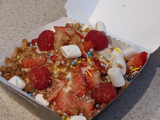 The second one we got was topped with cake batter icing, sprinkles, raspberries, strawberries, pie crumble, graham cracker, and marshmallows. Because they're so filling, we put this one in the freezer for later. Hopefully it reheats well!