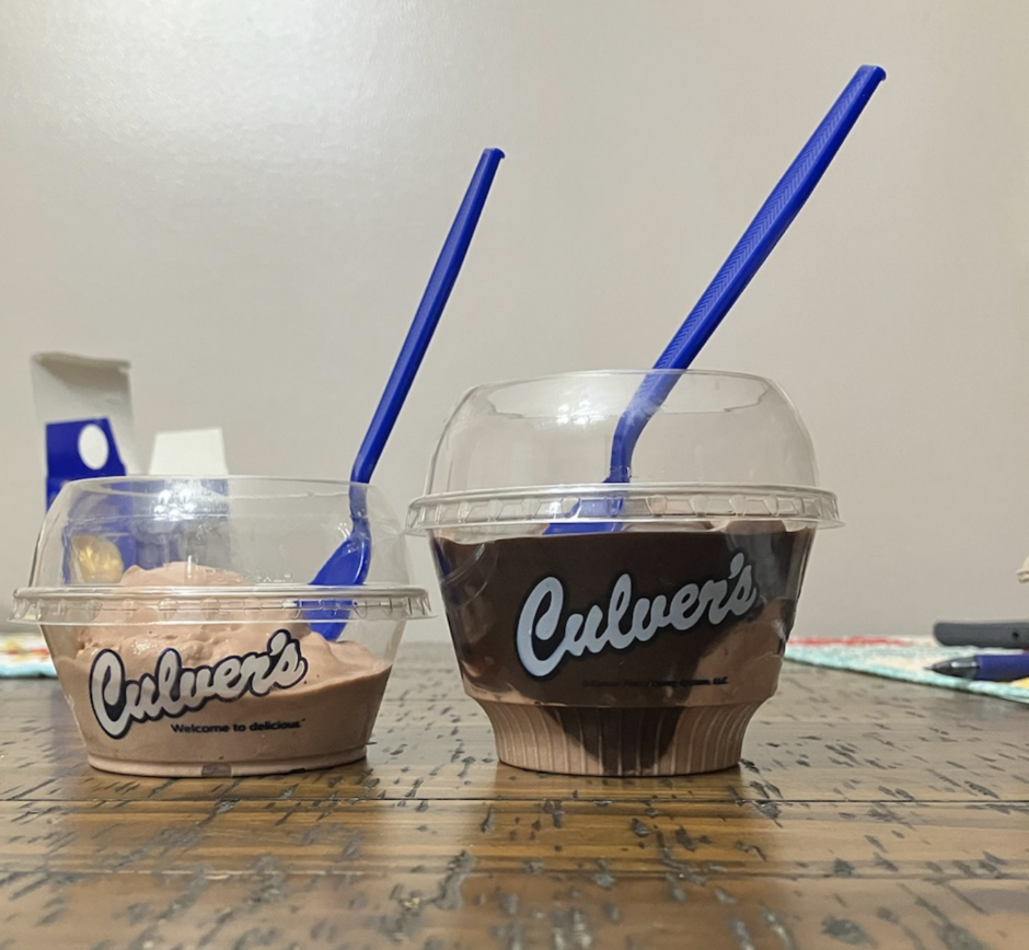 We enjoy the food at Culver's because it's always freshly made & the frozen custard is great. Tonight we had a problem with the visit. We ordered 3, single scoops of custard & got 2 different portions sizes. We've eaten here at least 17 times since Culver's opened, never have we been served such a small portion of frozen custard. When questioned about the sizes, we were told that the very small portion (portion on the left) is a single scoop. We always get a single scoop of frozen custard & they've always been the same size (portion on the right) regardless the flavor of custard whether it's the flavor of the day or a custard with toppings. Please explain this discrepancy for me because something isn't right! We are always served the portion on the right. Like I stated, we have never been given such a small portion, so either this portion was a mistake or the portions we received in every visit until tonight was a mistake. Which one is it?