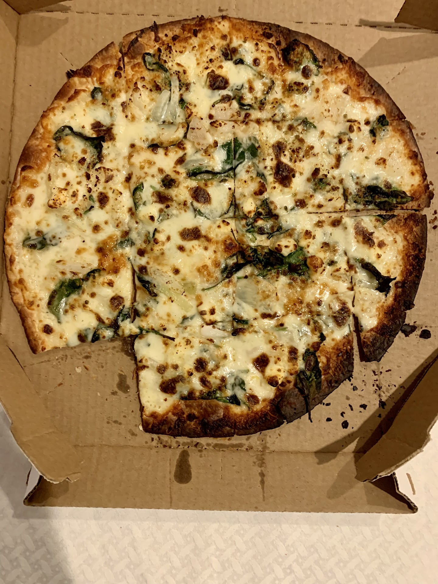 Ā Ā Ā Read moreI have ordered this feta and spinach pizza from different Dominoās branches many times, because my son really likes it. Tonight we ordered it from the Belmont Dominoās store and received a half burnt pizza. Worse than the pizza was the rude responses of the person who claimed to be the store owner when we called to complain. Without even giving us an email address to send him a photo of the pizza, he argued with us that his pizza was totally fine and we did not know how a thin crust pizza should be. Just look at the burned dough on one side and the black vegetables on top. Again, worse than pizza was the extremely rude responses of the guy...