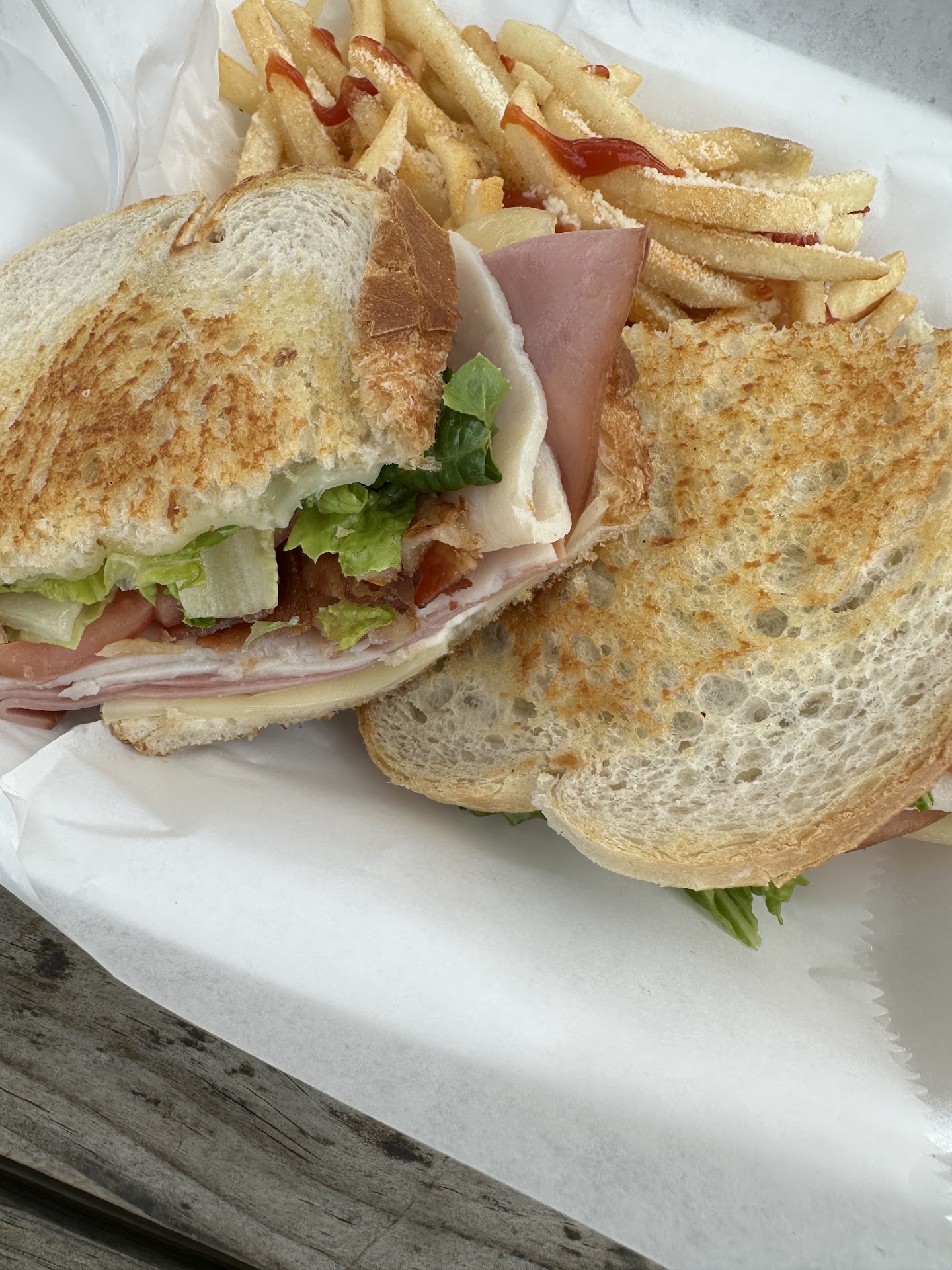 Ā Ā Ā Read moreGave this place a go. Service was quick & friendly. Went with the BLT chicken wrap. Hubby had the club sandwich on recommendations from the staff and we were not disappointed. Both came with shoe string fries. The fries were well seasoned & tasty. The wrap was huge. The sauce had a pleasant little kick. The sandwich was on lovely sour dough. Plenty of meat. Small place with only outdoor seating at picnic tables with umbrellas. Thereās a park across the street if you need a restroom. Thereās also a small parking lot. They sell canned drinks, ice cream and milk shakes although we...