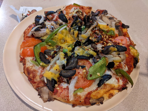 Ok, fine - we could forgive that if pizza was worth taking home. It's not. We both got the small personal pizzas and I got the combo with everything on it. First, the crust was rock hard for the bottom 10 mm, like a cardboard base, with a slight rise of dough above that. Did someone fail to mix in yeast properly? Were these a frozen batch of bad crusts they pulled out due to some shortage? The place wasn't packed, I don't get it. It was like some sort of sailor hard-tack. Second, the ingredients weren't cooked enough for a combo pizza so it was all watery and loose, and the cheese had cheddar thrown on there. Why? This doesn't match or improve anything. The ingredients themselves were the most basic from-a-can vibe things possible, basic black olives, nothing distinct or of a quality remotely as good as your average Pizza Hut or Domino's. The sauce was so thinly applied that it didn't bring enough flavor to compliment the bland vegetables and the poorly cooked cheese. And the mozzarella? Waaaay too much, it was just a giant 15 mm cheese patty beneath everything, lightly colored by the ghost of a sauce that avoided most bites. California has a bad reputation with pizza, and this is why.