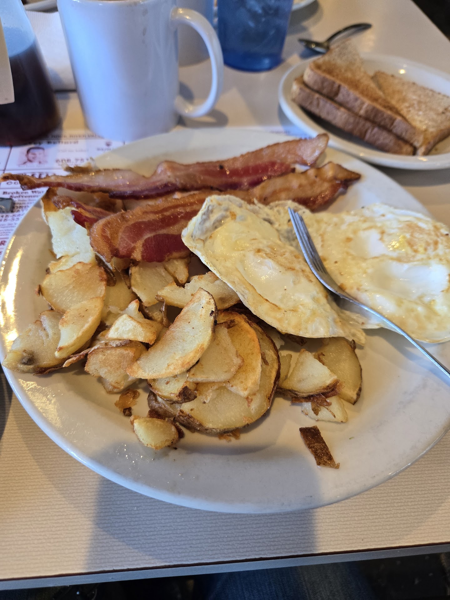We drove up and saw cars in the lot at 12:58, I thought that could be a good sign since it was the end of lunch rush and there were cars there. We walked in and was greeted and seated immediately by the hostess. After about 5-10 mins, the hostess came back and asked us if we would like drinks. I stated I would like a water & my husband would like water w/ lemon and a cup of coffee.
