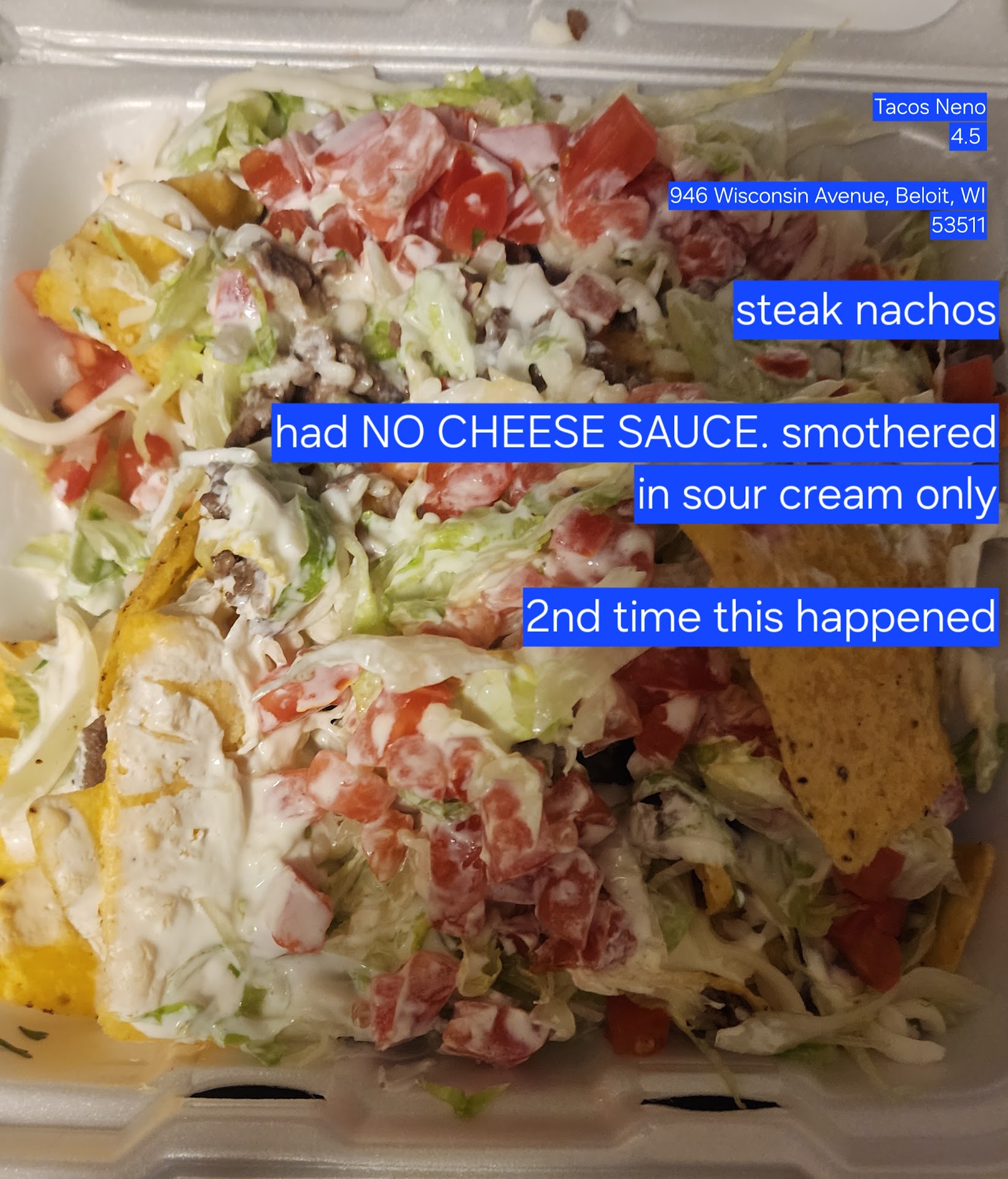 Read moreNormally the best chimichangas since We lived in Texas . But...Ordered for delivery. We usually absolutely love their food. Used to be very generous. Last 2 times, spent $40 for 2 Chimichanga meals and 1 $13.00 steak nachos. No cheese sauce on Chimichangas. Plus, they used to give you 2 full Chimichangas.. now it is 1 1/2... Here's the best part. There was NO CHEESE on $13.00 Beef Nachos. Or Chimichangas. Not sause, not shredded, none. NO CHEESE on NACHOS...WHAT??? Nachos were smothered in SOUR CREAM. NOT CHEESE. (SEE PICS) I called the restaurant, & the girl said they ran out of cheese.. she would have manager call me back. No call. I love their food, so tried again about a month later. SAME EXACT THING, No cheese..at all. What mexican restaurant takes cheese completely off every normally cheesy item? Also, mexican street corn was plain corn.with dollop of white stuff (mayo, sour cream?) dont know, really. That was it. Then plain canned corn for $5.00 Is sad, because they used to be ny favorite restaurant, and request for chips and salsa is...