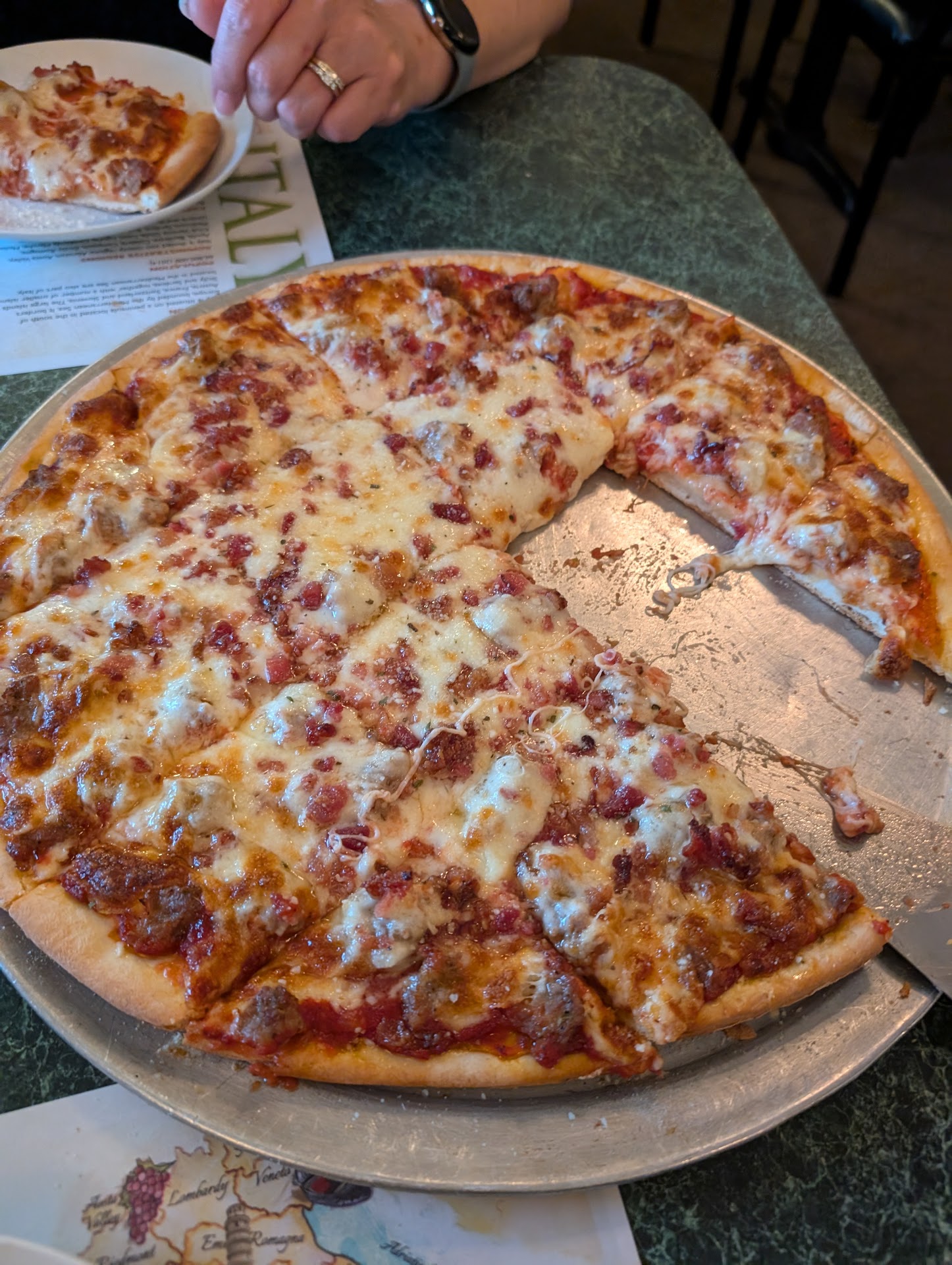 Inside, the vibe is cozy and casual, and the staff is super friendly. We ordered The Works pizza (minus the anchovies) and a sausage pizza, and both were absolutely delicious. The crust was perfectly crispy, the cheese was gooey and flavorful, and the toppings were generous. You can tell everything is made with care and tradition. It’s not trendy or over-the-top, just really good pizza done right.