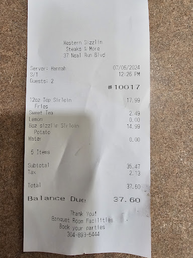 Read moreMy husband and I made our first trip to a western sizzlin and we were kind of in sticker shock over the pricing and the weirdness of the menu when the menu has to be explained to you you know that something's not right with it. This comes with a side this doesn't you can get a baked potato side you can get a salad bar side but it costs this much but a regular salad bar is this much and on and on and on it was like standing at the register and being read war and peace. My husband ordered the chicken fried steak and I just did the special which was chopped steak I guess they called it. We also each got a salad bar side. Now the salad bar I must say was very nice but I wasn't too keen on the guy just dumping new on top of old. When our food came my husband's plate looked pretty good but my chopped steak it was like a hamburger patty that was pretty charred about the size of the palm of my hand. Definitely not what I expected. Our server she was very delightful and nice and the tea was good. So whilst the visit wasn't a total disaster the pricing was insane and like I say the menu it's like just make it basic don't have things written on two different walls On half a dozen different wipe off boards. Keep it simple. We won't be back but only because it just wasn't our kind of place. I think we'll just go ahead and make the drive to chillicothe to golden corral because a steak for $20 with a side at western sizzlin...