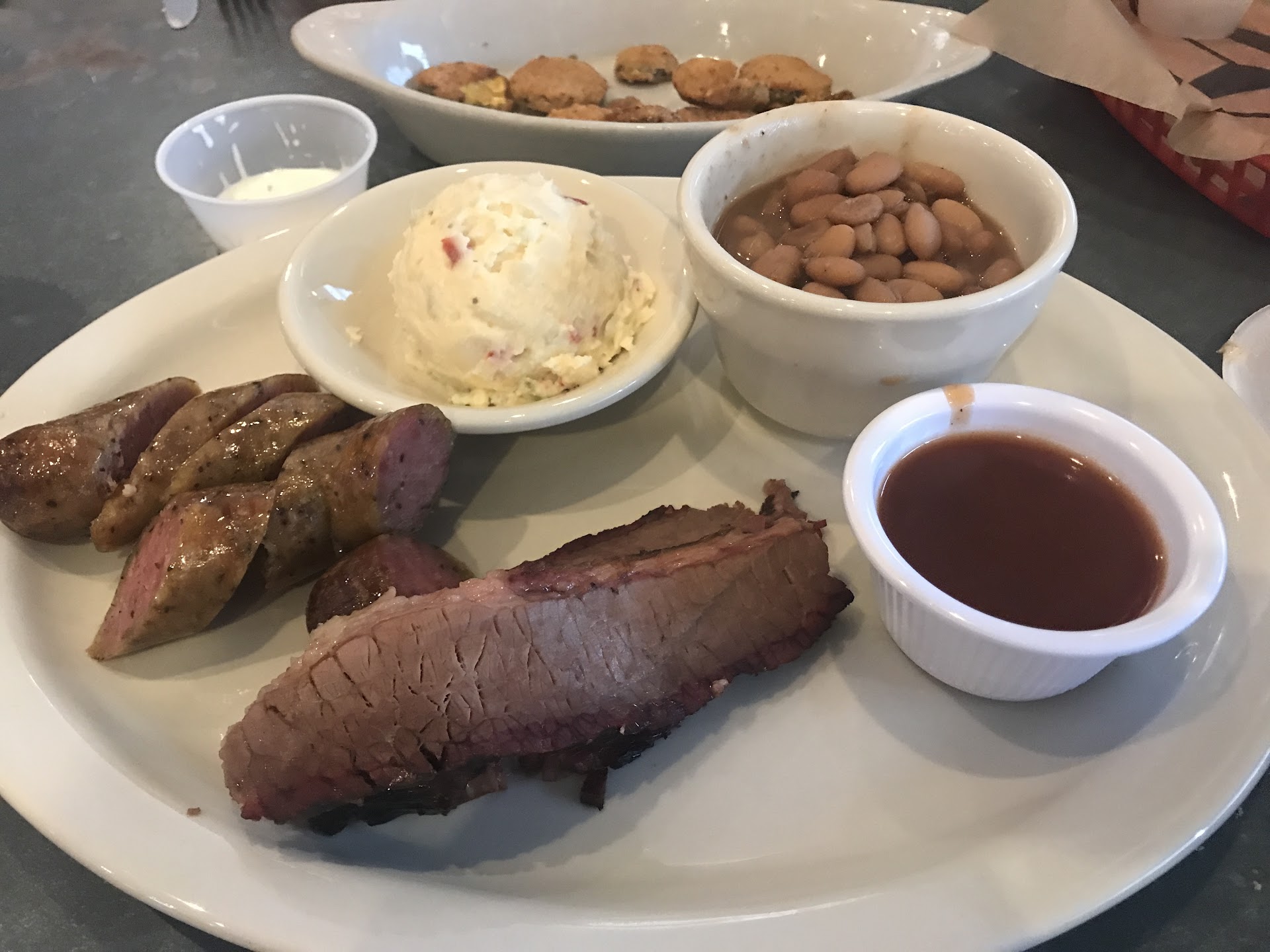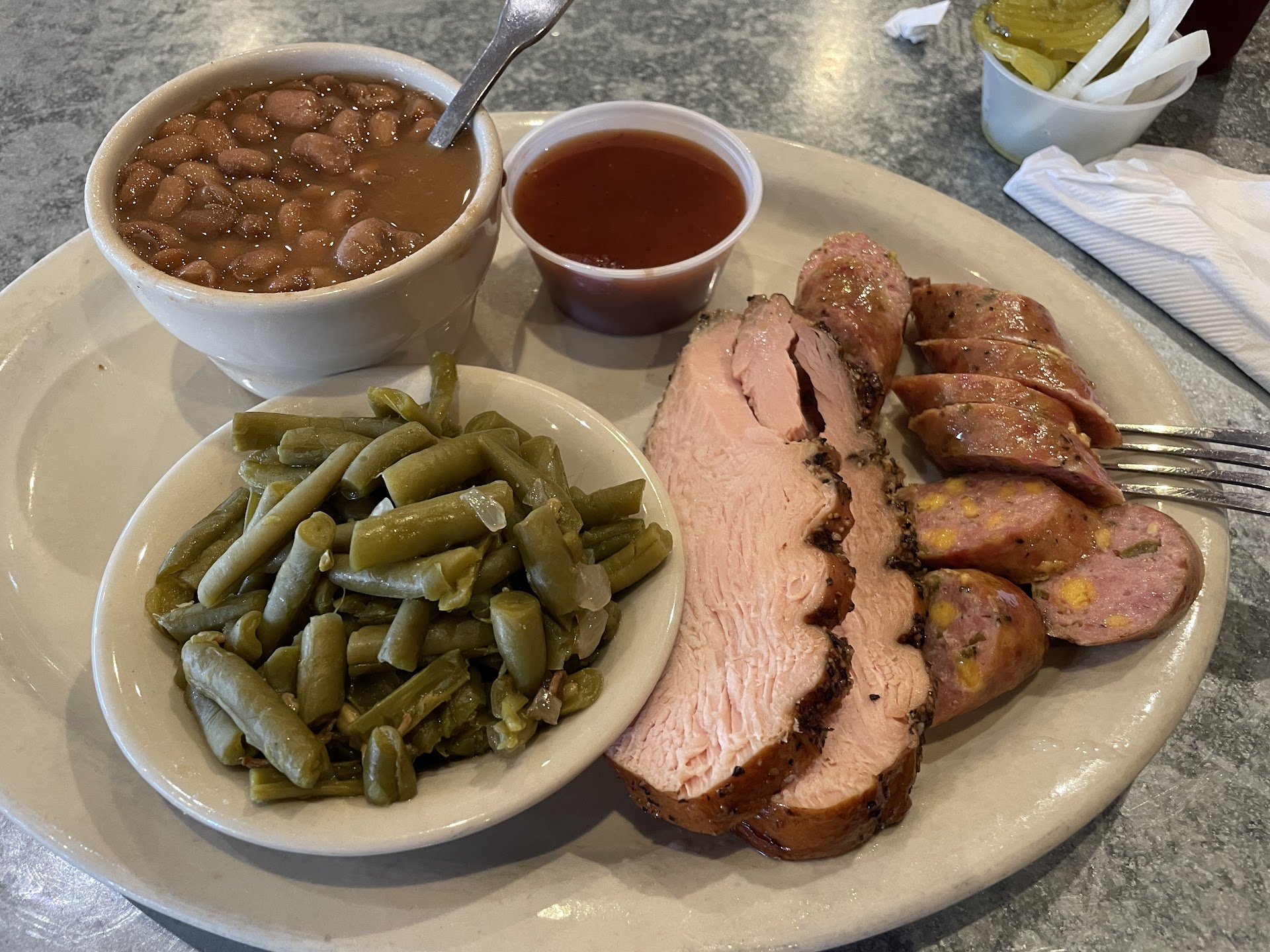ORIGINAL REVIEW: Nice, big restaurant with table service vs the more common cafeteria style service you find in many other BBQ restaurants. Waitress was very nice and attentive. Only downside was the BBQ. Overall pretty bland without much smokiness to it at all. I had the double meat plate with turkey and jalapeño sausage with pinto beans and green beans on the side. Here's a breakdown: