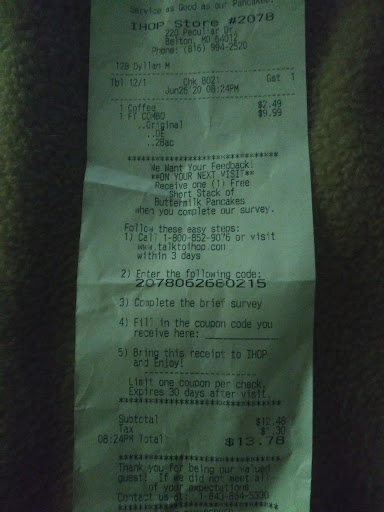 Read moreWhen you go to IHOP, you generally have certain expectations of that type of restaurant. You know what kind of breakfast you're going for and how the coffee will generally taste with the normal creamers and pink/yellow/blue sweeteners. The syrup is going to taste like it usually does and the atmosphere is the same at any of these chains most of the time.