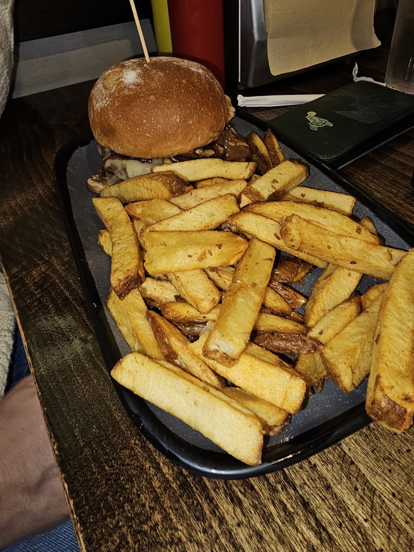 A single order of regular fries: $7. A single order of garlic fries: $8. A bit pricey, but fair. All burgers come with regular fries... but if you want to upgrade to garlic fries, they charge $5. How is it that a full order of fries has a $1 upcharge for garlic, but a side that comes with your burger costs 5x that just to add garlic? Upgrading to tots is also $5.
