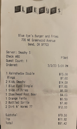 Smash burgers have an origin as a way to enhance the texture and flavor of cheap, overly fatty ground beef. Just like loading onions into the meat, it’s a way to make poor food palatable. These are techniques to push inferior ingredients towards mediocre. When you start with great, fresh ingredients, like Blue Eyes has done, these depression era techniques work in the same way: they push towards mediocre.