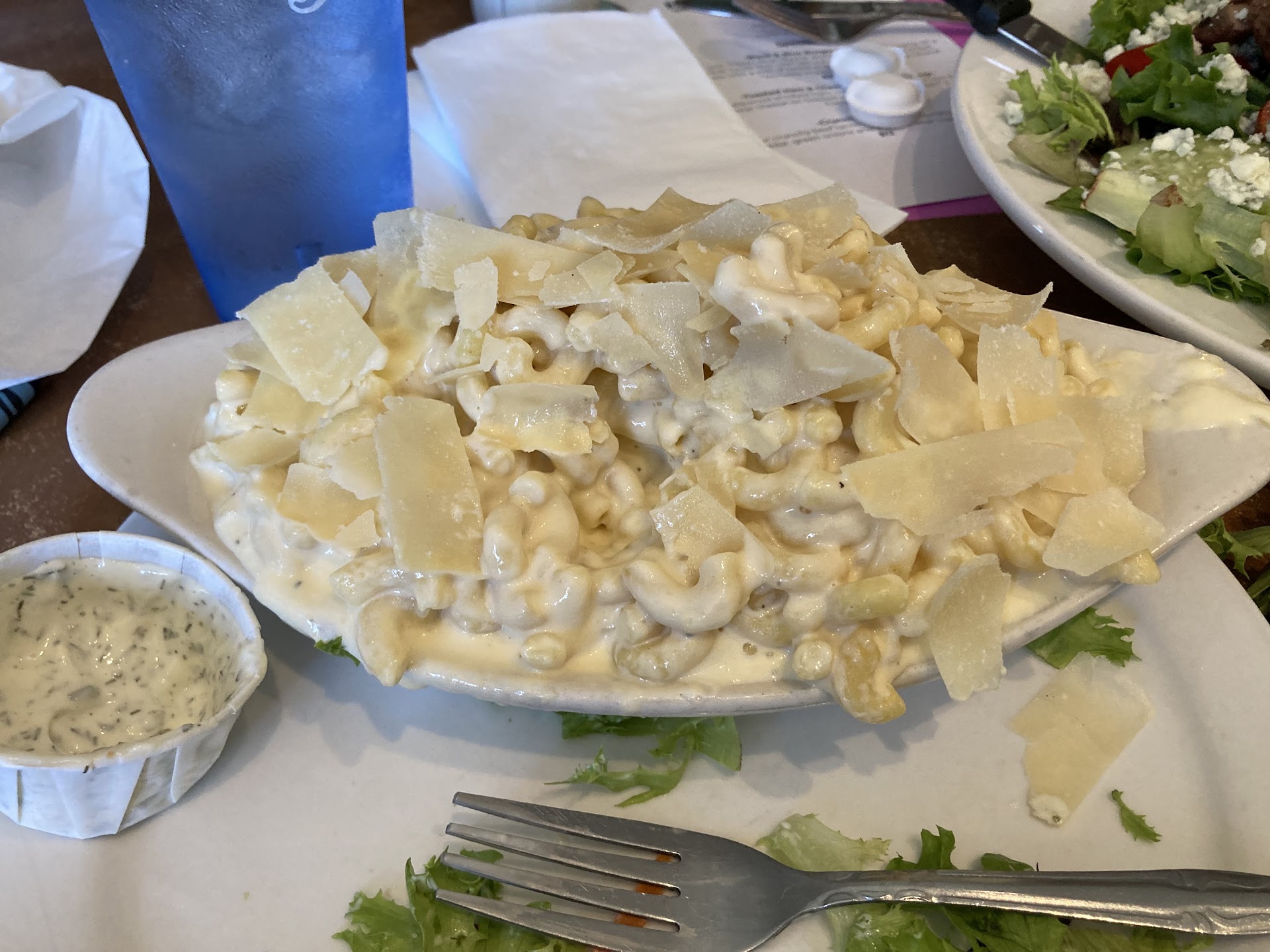 Read moreThe place is clean, has indoor and outdoor seating, and plays good music. I was here with my two year old and another friend and two year old. The server was nice enough, but only listened to half of our order requests and then barely came by. I ordered a Mac and cheese and a steak salad. There are two sizes of steak salad, so I asked for a small and with the steak on the side. I received a large ($4 more) and the steak on the salad. The Mac and cheese was lukewarm at best and the macaroni was parboiled. It really should have been heated in the oven in my opinion. It wasn’t even hot enough to melt the flakes of Parmesan on top. Maybe this is what is intended because when I told her it was cold, she brought be a new one that was fresh and it was still barely warm. The milk I got for my kid had ice in it. We did grab crayons once I noticed them, but these would have been a nice offer. The salad were generally good and the ranch dressing was delicious. Overall though it was kid of a mediocre experience. Perhaps I just had higher expectations given the location and...