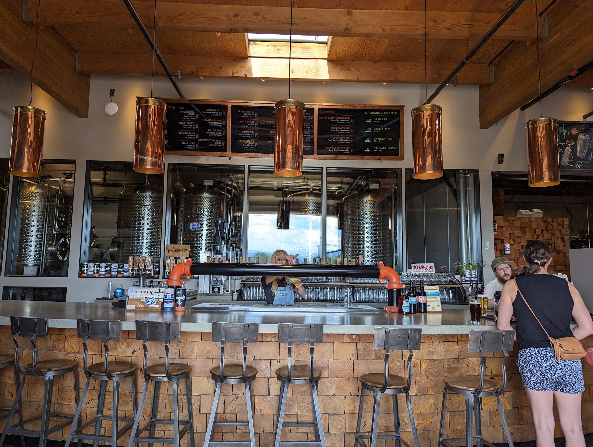 Read moreI have not have an overall good experience here in the 3 or 4 visits I've made here. Today's was the worst and I won't be back. Crux has various places to sit and enjoy the beer, indoors and out. One of the choices is the benches along the outside wall which capitalize on the views (gorgeous) and the sun-warmed wall (wonderful in the cooler months.) If you choose to sit here rather than a table inside or tables in the tented area outside, you need to get your own drinks if you don't want to wait quite a while. This should be fine, but it is always a pain. You stand at the bar, hoping to be noticed, and then are allowed to place your order. The bar servers are busy, but I have been many places where the bar is busy and have gotten good service. I have not yet gotten good (friendly) service at Crux in this situation. I must say, I have gotten good service when seated inside. Today I ordered, the bar server (a consistently surly employee in my experience) rinsed the glasses and left 2-3 tablespoons of water in my wine glass, then poured the wine. When I pointed out the glass had water in it and I would like to have him pour another, water-free glass of wine for me it pissed him off. He was rude and didn't apologize for not noticing there was still water in the glass. He did pour me another glass of wine without rinsing the glass. I bought the wine and one beer and it cost $14, which is on the high side, even for craft beer, even in Bend. I definitely won't be back. There are too many great places to enjoy...
