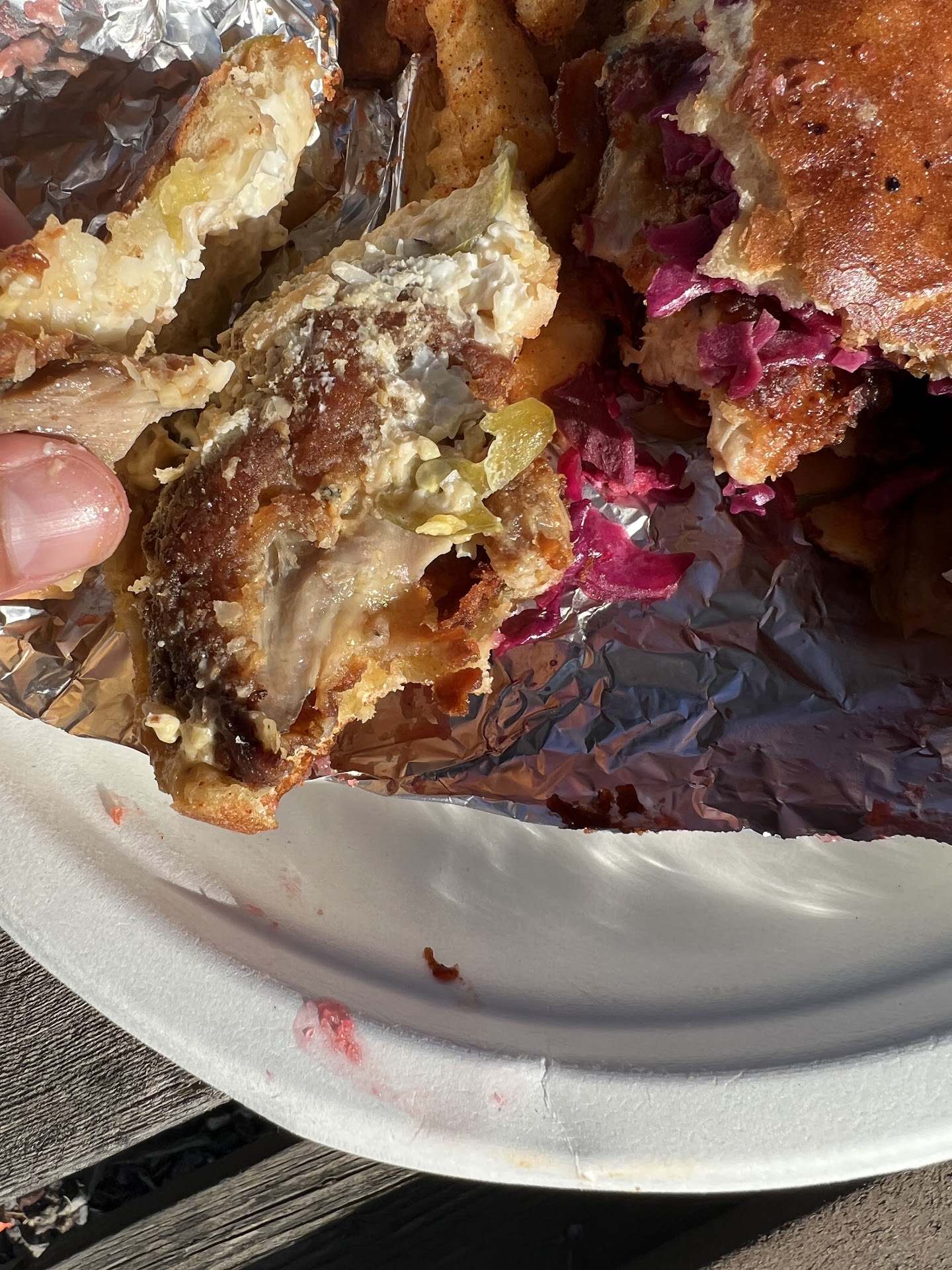 Unfortunately, Fresco and Fryed was a massive disappointment. We ordered the Best Coast Hot Chicken Sando and Rude Boi chicken sandwich. The menu and website makes the food appear like a fine dining experience with elevated flavor profiles. The Rude Boi was incredibly over-fried to the point where the protein darkens and is chewy in texture. In addition, excessive amounts of jalapeños and sauce made the bun soggy and unpleasant. On the other hand, my chicken breast was fried perfectly and was juicy/tender. However, my pickled veggies were so wet that they disintegrated into mushy pink paste that ruined any textural interest. The aioli was UNSERVABLE, due to its heat level. I could only get through a third of the sandwich and I have a heat tolerant palate. But It’s always alarming when there are distinct disparities in “doness” especially when it concerns poultry items. That alone is reason to take your business elsewhere. My last issue is with the crinkle cut fries…where on the menu and online does it show crinkle cut fries? Clearly they were deep fried from frozen and coated in a ridiculous amount of seasoning as you can from the pictures. It was truly a salt lick of the highest order. For $50, I expect more. Otto’s Landing, however, is a fantastic place to grab a drink and socialize. I would suggest trying any other food truck...