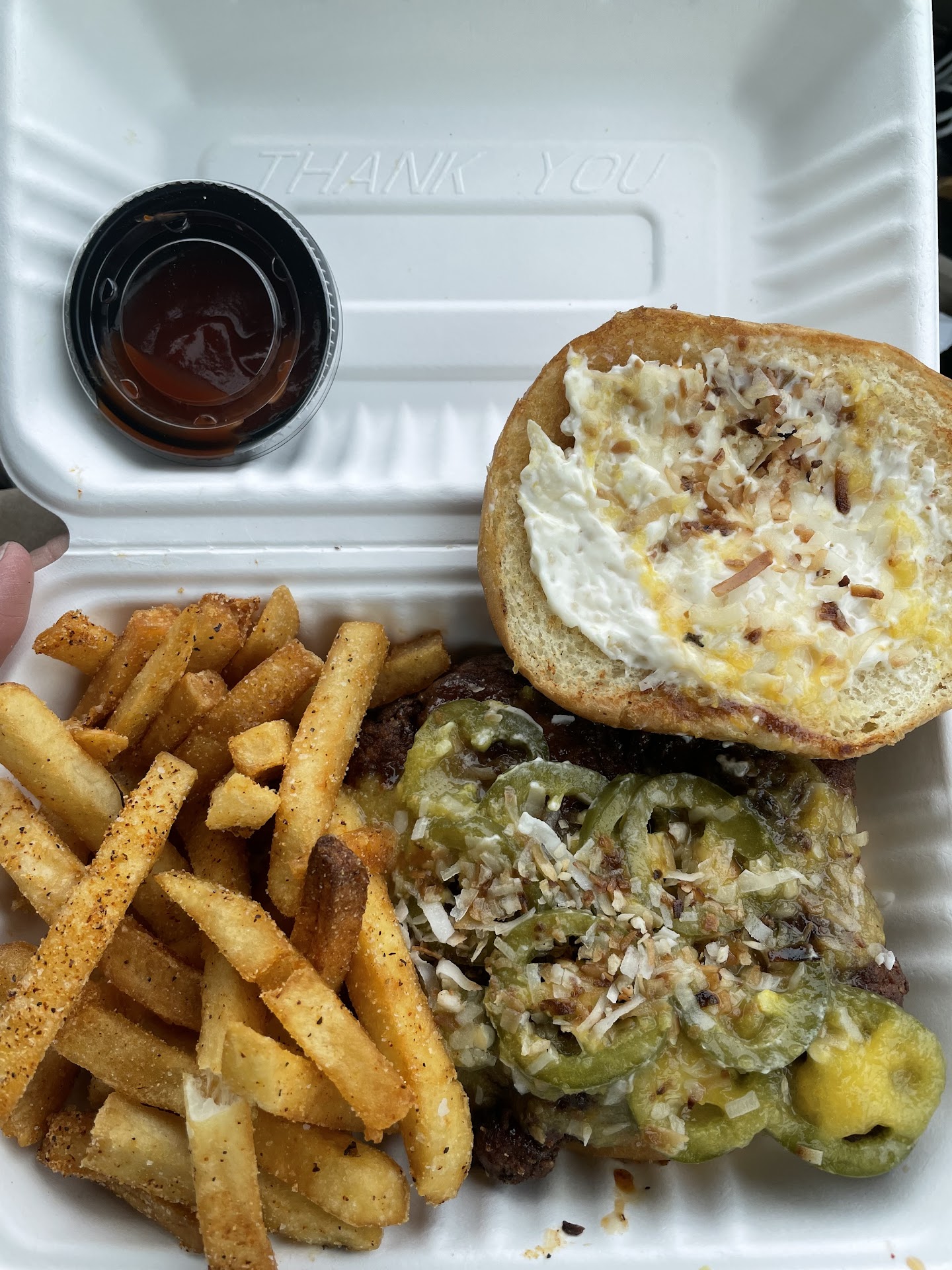 Edited to add: Owner's response to this review acknowledges that we were served our meal without all of the ingredients, and they didn't try to rectify it in any way. The burger was mediocre because it was incomplete! Rudeness was detected by my husband picking up the order, I wasn't there to witness the interaction to confirm or deny the emotions present. My own opinion of the burger I ate stands, as does the money I paid for half...