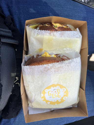 The menu is packed with delicious options. I tried the GoodEgg Sandwich, and it was fantastic. Scrambled eggs, cheddar cheese, Good Egg mayo, and scallions on perfectly toasted bread – absolutely delicious. My friend went for the Spicy Korean Pork sandwich, and it was a hit too. The flavors of the pork, scrambled eggs, kimchi, and cilantro were just amazing together.