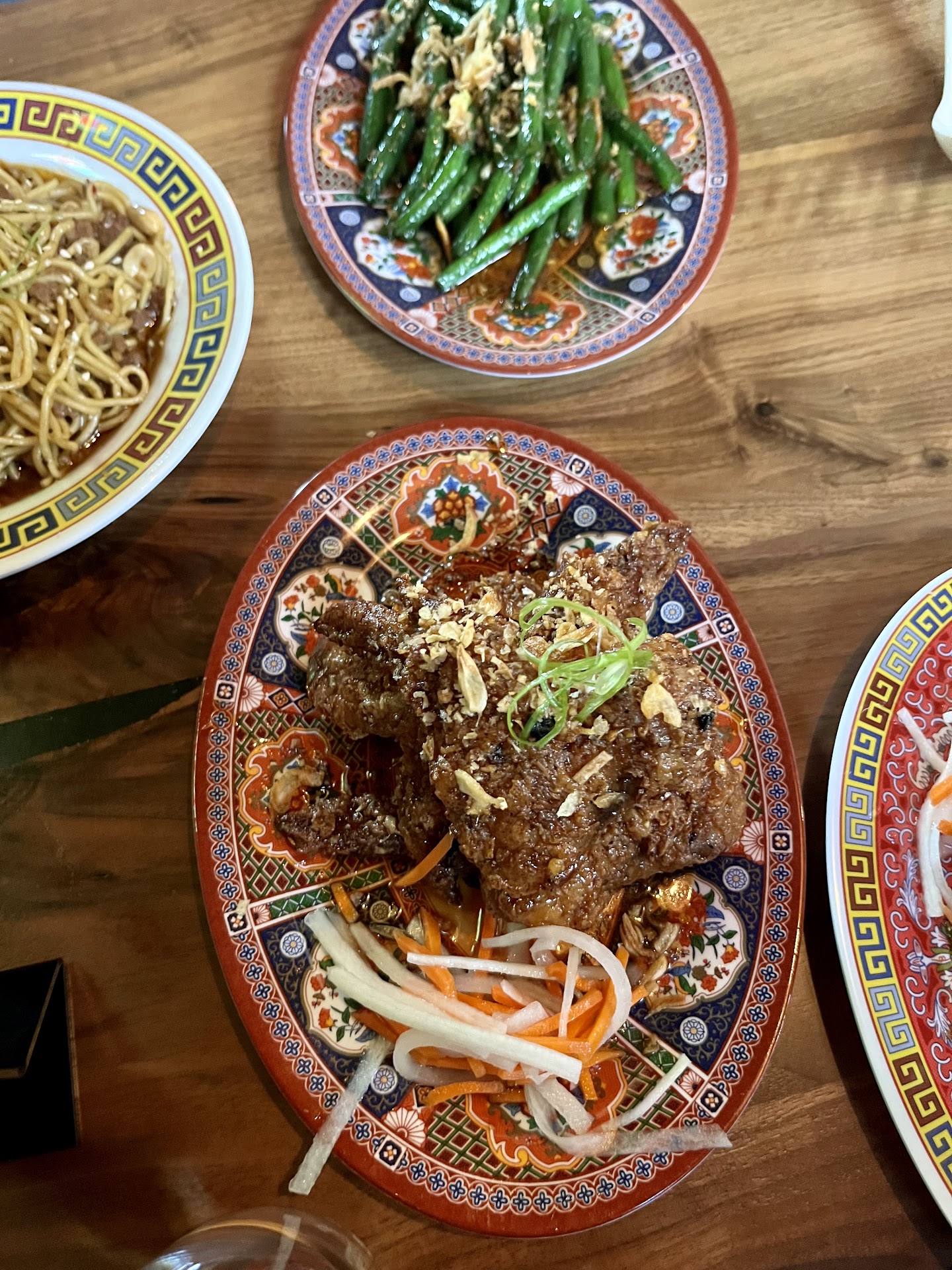 We started with their Far East Chicken Wings and Green Beans, as well as every mocktail on their menu. Everyone at our table agreed—the chicken wings were perfectly crispy, so tasty, and a perfect way to start the meal. These are a must try. The Green Beans were perfectly seasoned and fabulous. The mocktails were creative, refreshing, and perfect balance of sweet and tart. We can only imagine how amazing they will be when the liquor license comes through and they are transformed into cocktails.