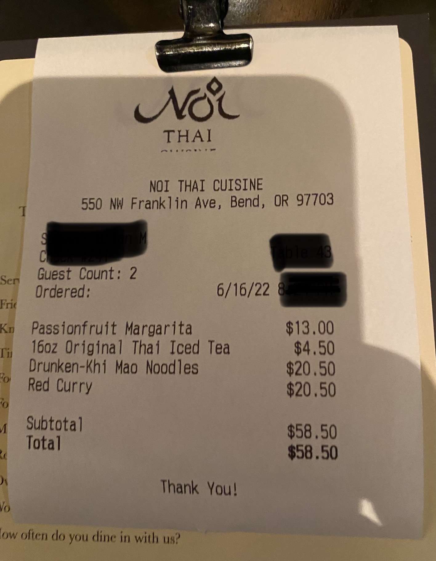 We went to dinner at Noi last night and were not happy. First, the table we were given was not properly bussed and the previous customer's crumbs coated the upholstered bench. Because the hostess who brought us to the table had disappeared and no wait staff had come to the table or was visible, I returned to the front desk to get some help. No one was there, either. When I finally located the hostess, she allowed that, if I wanted, she could have the table bussed properly. I allowed as that would be good and she returned with a rag and cleared the crumbs. I sat down and we waited -- and waited. We had been given one multi-page menu for the two of us, a multi-paged publication, the pages of which were stuck together with food detritus from earlier customers. When our server finally appeared and asked us if there was anything we would like before ordering our meal, I told her that we would like two menus with clean pages. She responded: (1) that they were running short on menus but she would she what she could locate and (2) that most people got the menu on their smartphones using the QR code posted on the table. Because we find that reading a menu on a smartphone a particularly frustrating experience, I suggested that we would prefer paper menus. She returned a few minutes later with two more menus coated with food detritus and explaining that they were getting new menus next week. At this point a half-hour had elapsed since we were seated. We ordered cocktails that did not appear at the table for another 10 minutes. In the interim, we decided to order food. As an appetizer, we requested Miang Kum, a Thai appetizer that consists of betel leaves that you fill with assorted condiments. The server told us that they were out of basil (sic) leaves but could serve the dish with lettuce leaves, to which we agreed. As a second appetizer, we ordered fresh rolls, which the menu describes as a rice roll stuffed with rice, assorted vegetables and shrimp, with shrimp and pork for protein. The server responded that they were out of the shrimp and pork but could serve it with tofu. We decided not to order the fresh rolls and proceeded to order our entrees, a Panang Curry and SpicyThai Basil Stir-fry, with shrimp. Shortly after placing our food order, the cocktails arrived and, within minutes, the Miang Kum, with lettuce leaves, 80% of which were so small that it was nearly impossible to fill and eat them without coating your fingers with the sticky sauce that is part of the dish. When the entrees arrived, the stir-fry came with pork instead of the shrimp we had ordered. Totally frustrated at this point, we ate what was put in front of us, without further complaint. Just before we finished our food, the server appeared with the entrรฉe we had ordered, and said that she recognized that a mistake had been made and that we were free to take the entrรฉe with us, without charge. Needless to say, the evening was a dismal failure, saved from being a total disaster by the fact that the food was, as always, very good (and, of course, by the...
