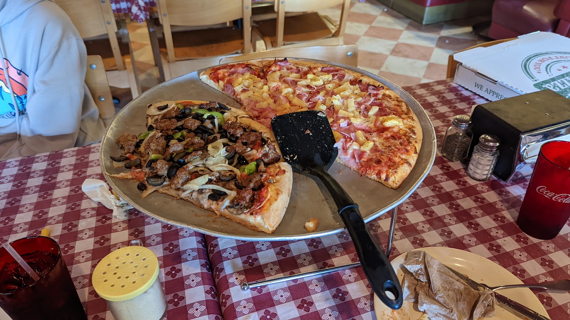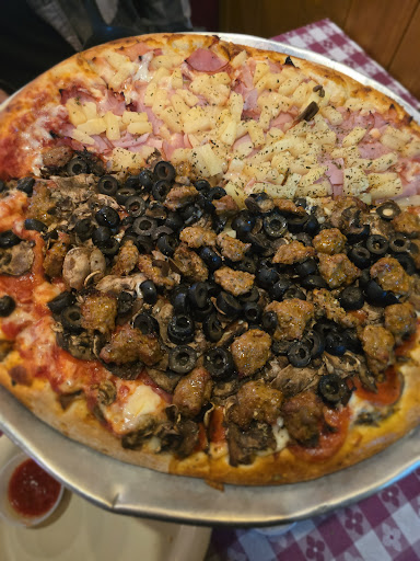 Read moreWe were passing through Bend and we stopped at Olde Towne for dinner and this place was great. True to the reviews they put a ton of toppings on the pizza. Almost too much, as the pizza crust can barely hold up from the weight at times. But that's a better option than lack of toppings. The staff was super friendly and the place was clean, including the bathrooms. It does have an old times feel from a sit down pizza joint from the 80's. Two pizzas took about 30 minutes. But the place filled up quickly around 5:00pm in a Saturday so I imagine waits can get longer when super busy. The pizza tasted great, it just wasn't the best I've tasted that's why I gave 4 stars. But definitely a good pizza, I would visit again if passing through. Also there is additional parking in the back so you don't have to fight for a spot...